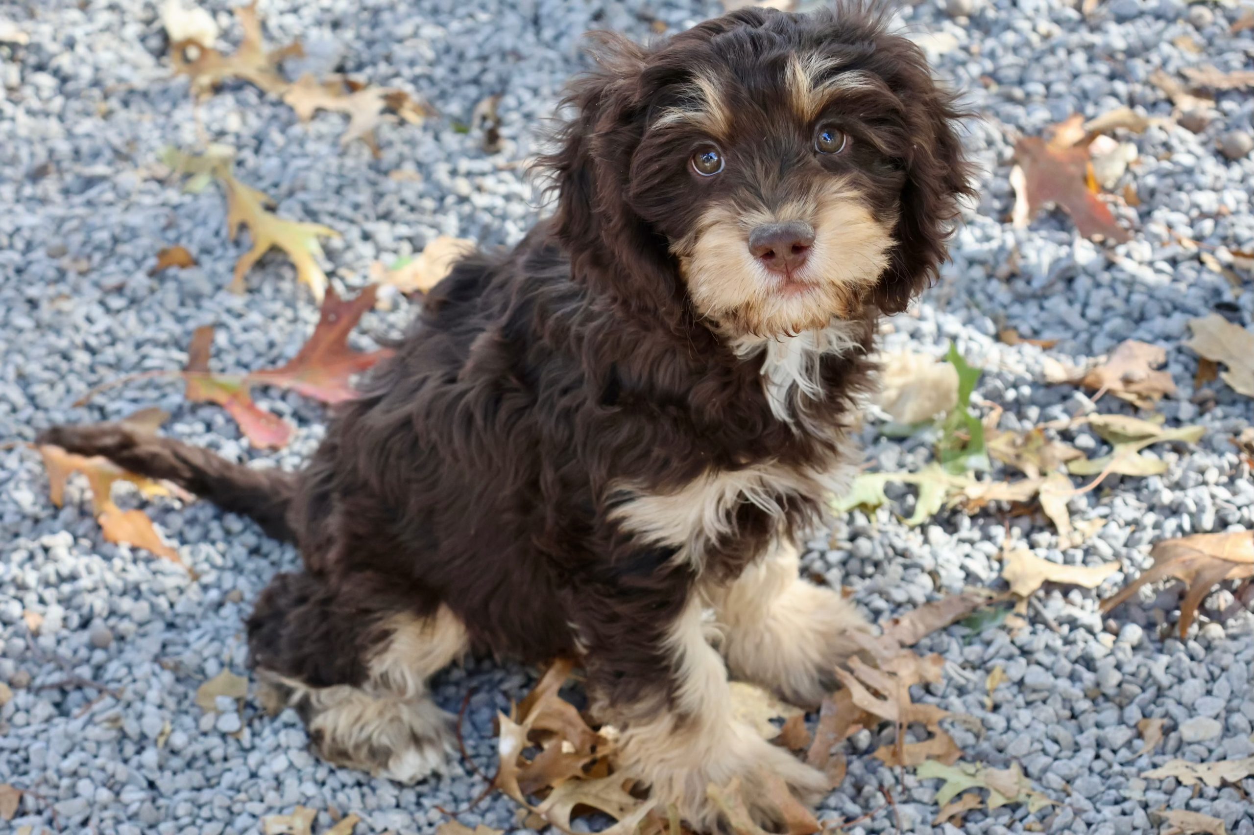 Our handsome trio of F1 Cavapoo boys are dressed in rich fall shades of chocolate and apricot. Born August 28, these little gentlemen will be ready to join their forever families on October 24. Expected to reach 13–15 lbs full grown, they’re the perfect size for snuggles on the couch or adventures outdoors.