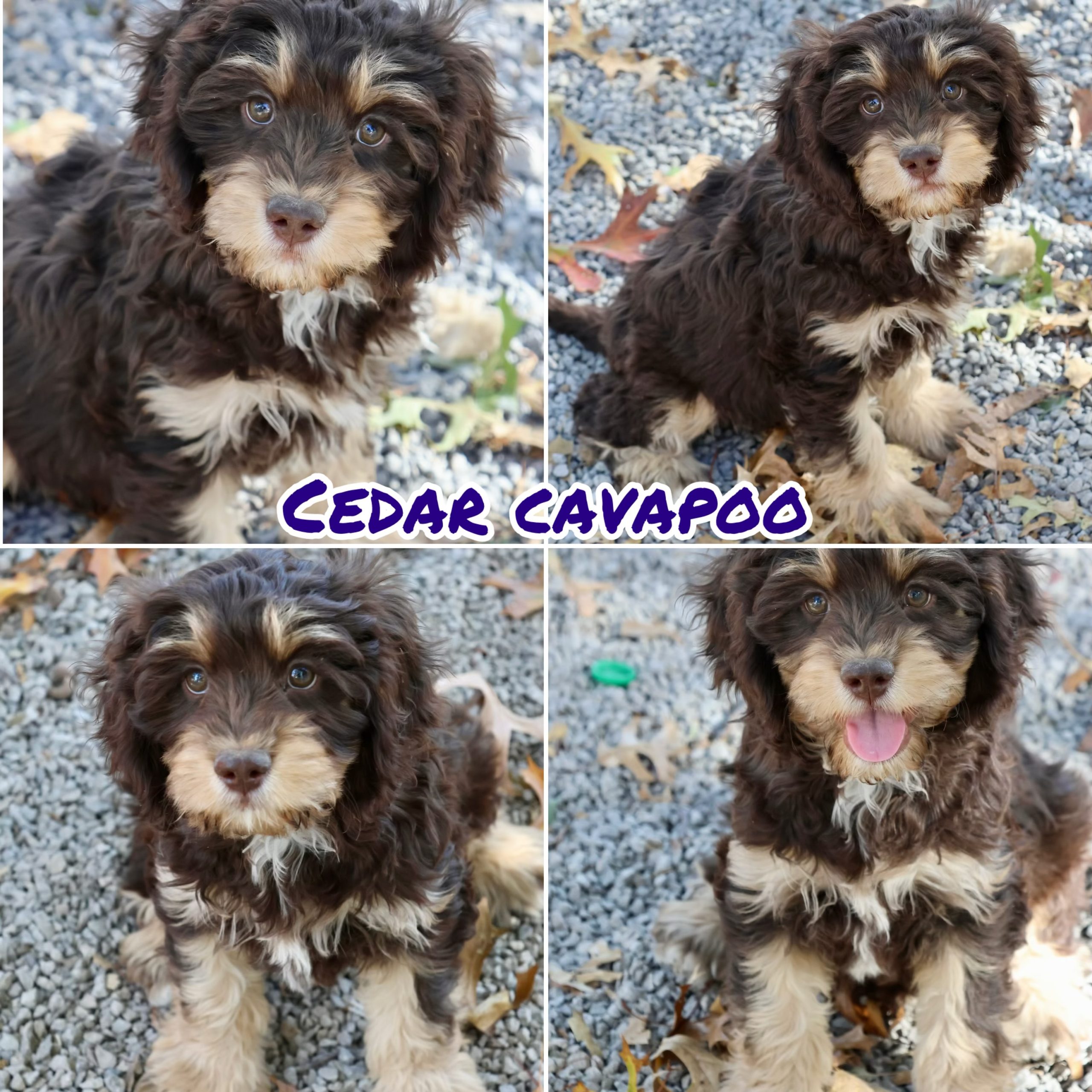 - Cedars F1 CAVAPOO MALE choc phantom this boy has stunning green eyes and a cute little pink nose that he’ll carry with him the rest of his life if you are looking for an easy-going, laid-back companion for kids or an older couple or even a second companion for your existing dog cedar wood fit the bell. He’s a great bang for your buck adult weight will be 20 pounds. $1950