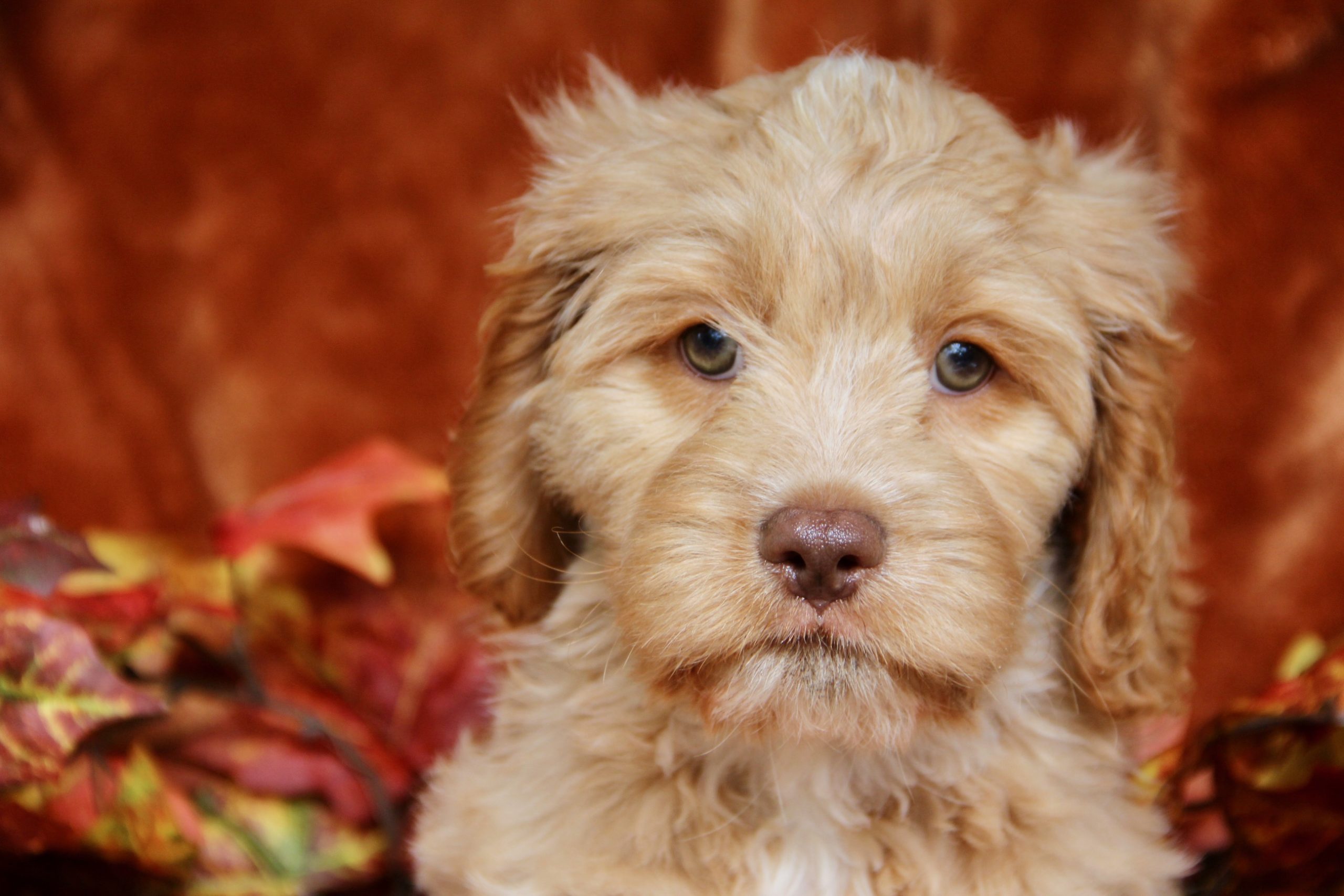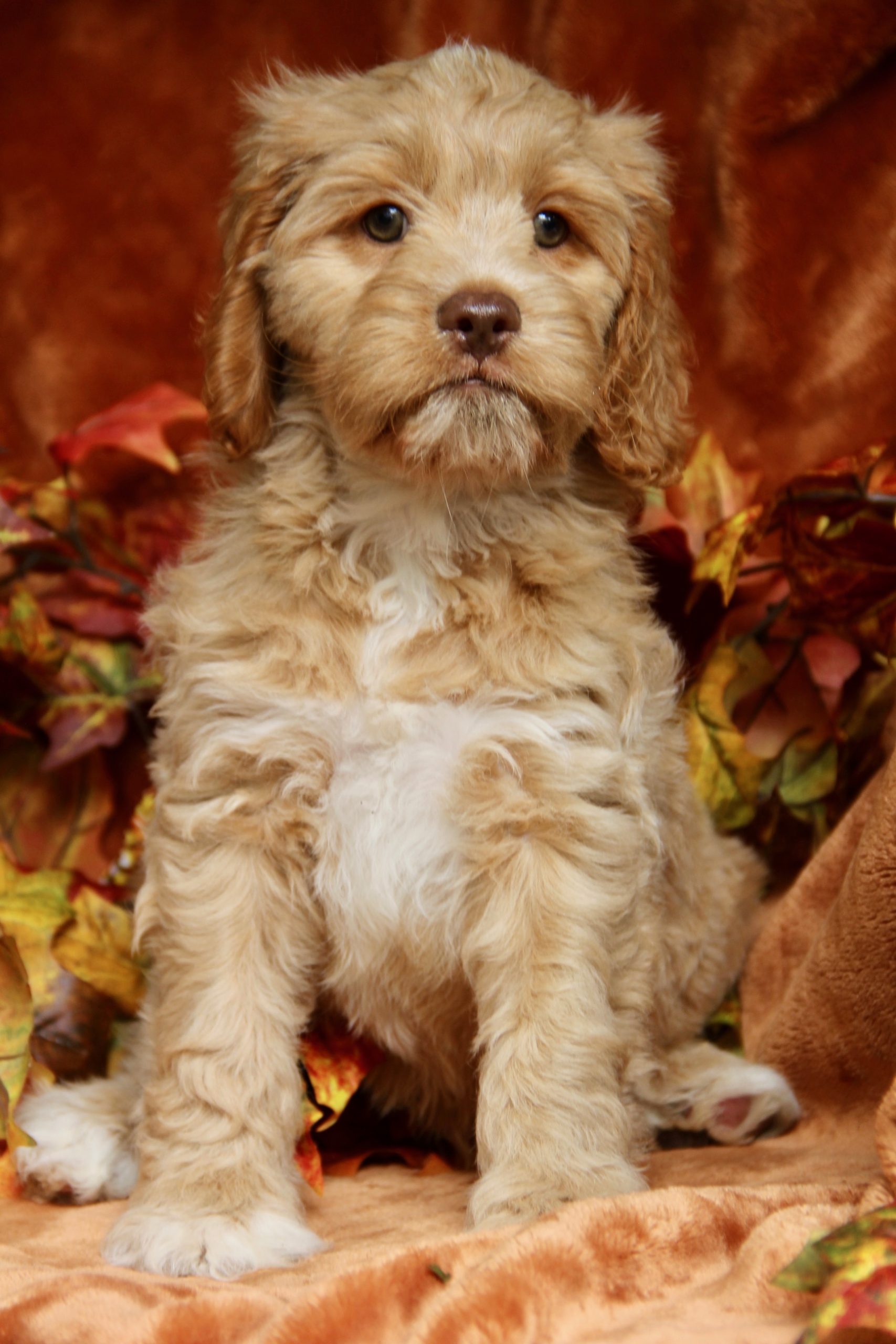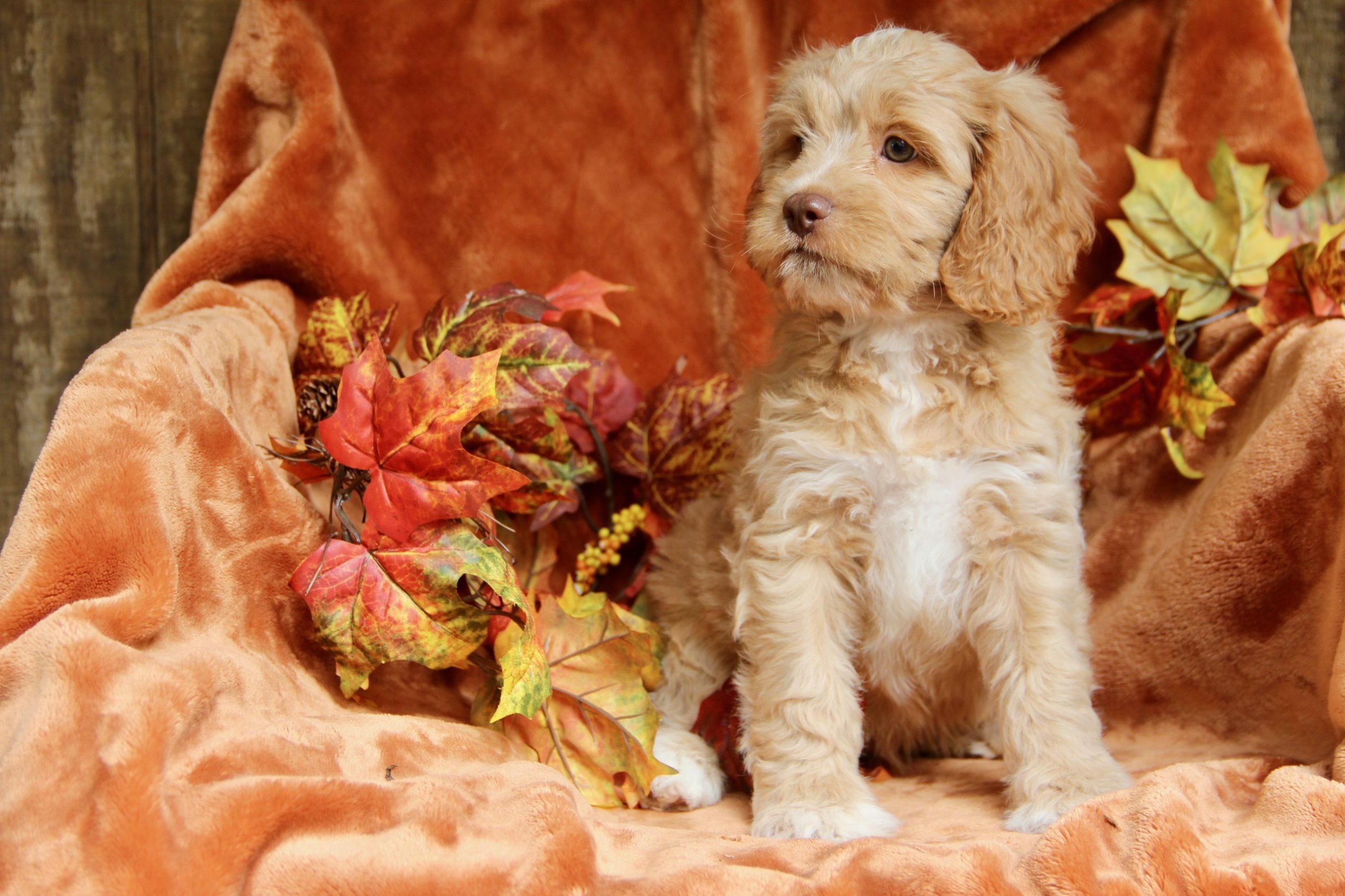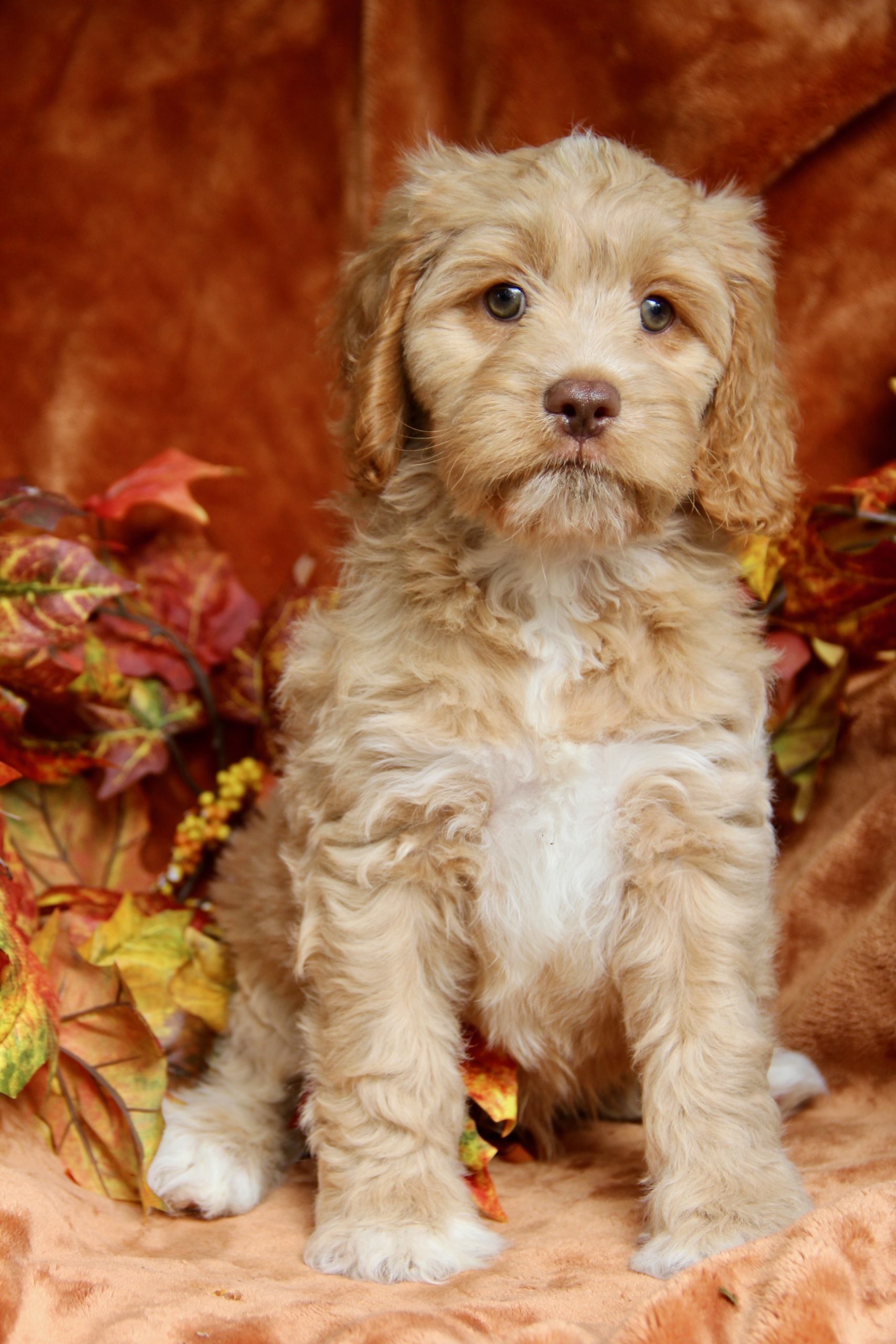 Our handsome trio of F1 Cavapoo boys are dressed in rich fall shades of chocolate and apricot. Born August 28, these little gentlemen will be ready to join their forever families on October 24. Expected to reach 13β15 lbs full grown, theyβre the perfect size for snuggles on the couch or adventures outdoors.