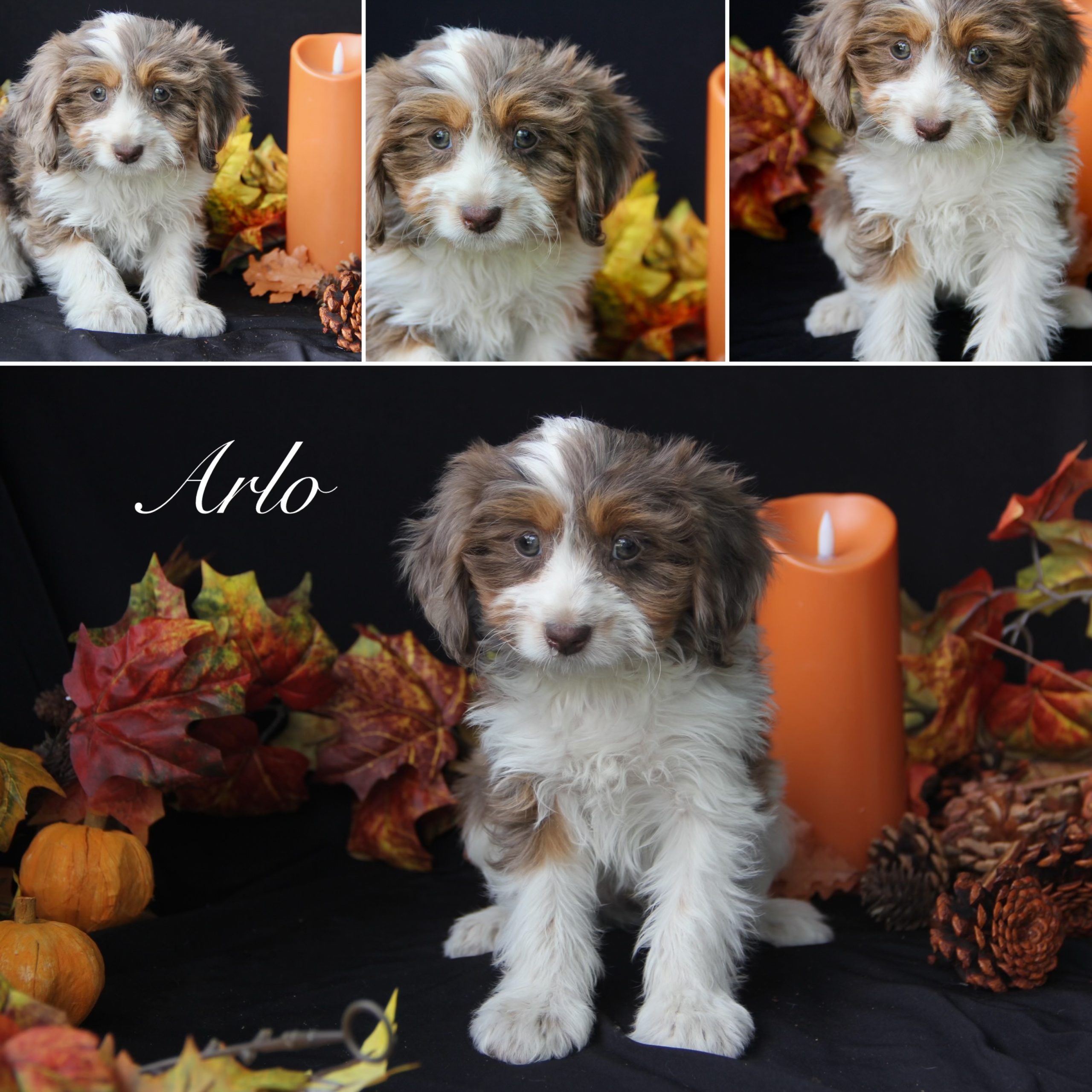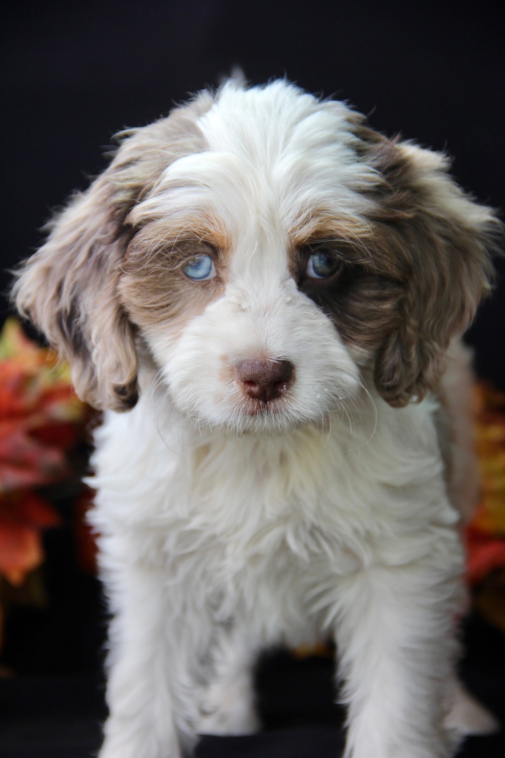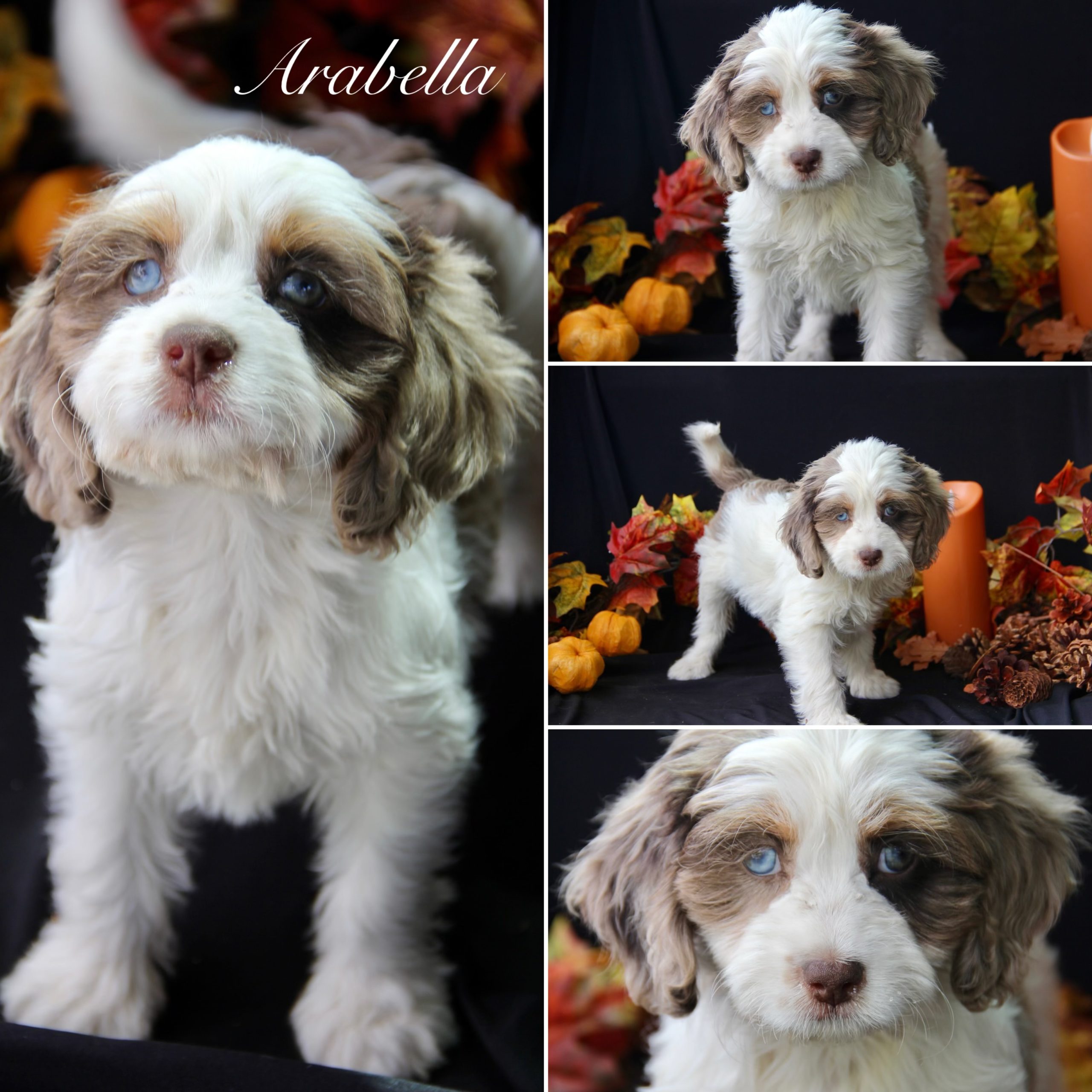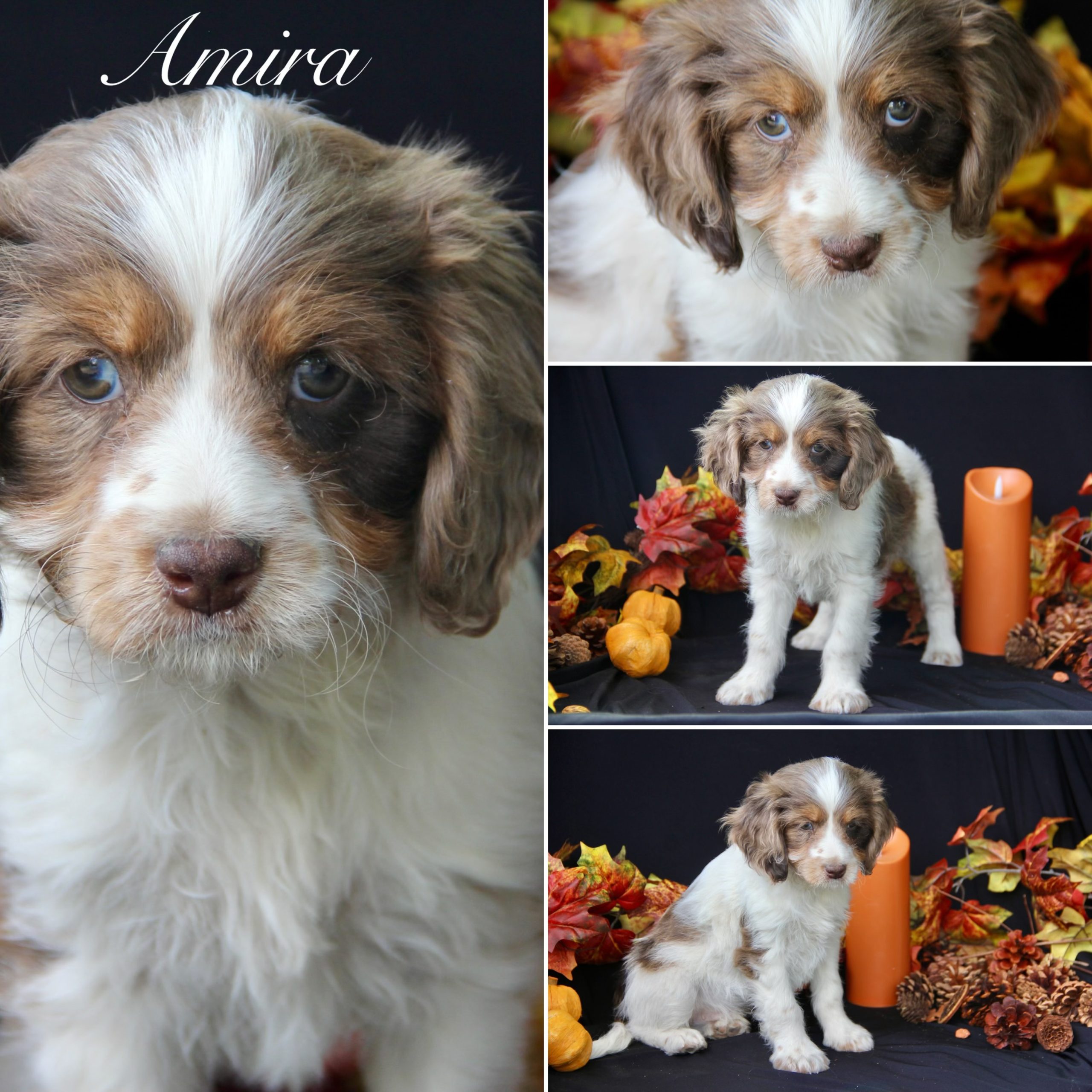 • Breed: F1 Designer Mix (Chocolate Merle Tri Parti)