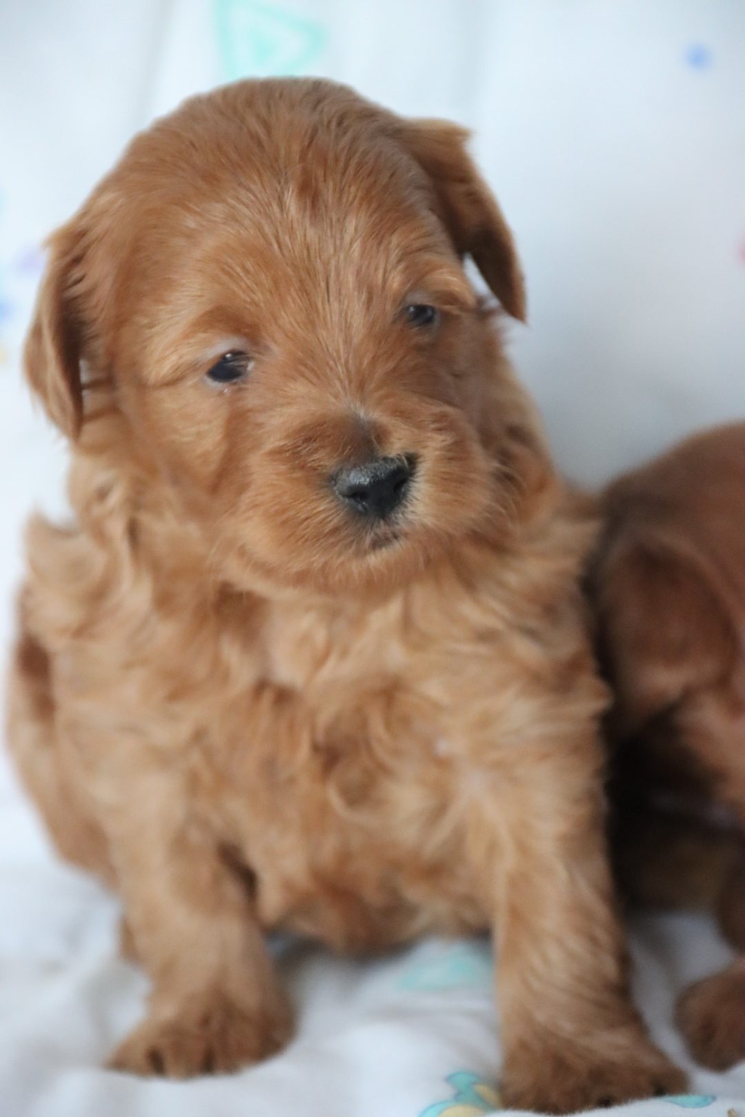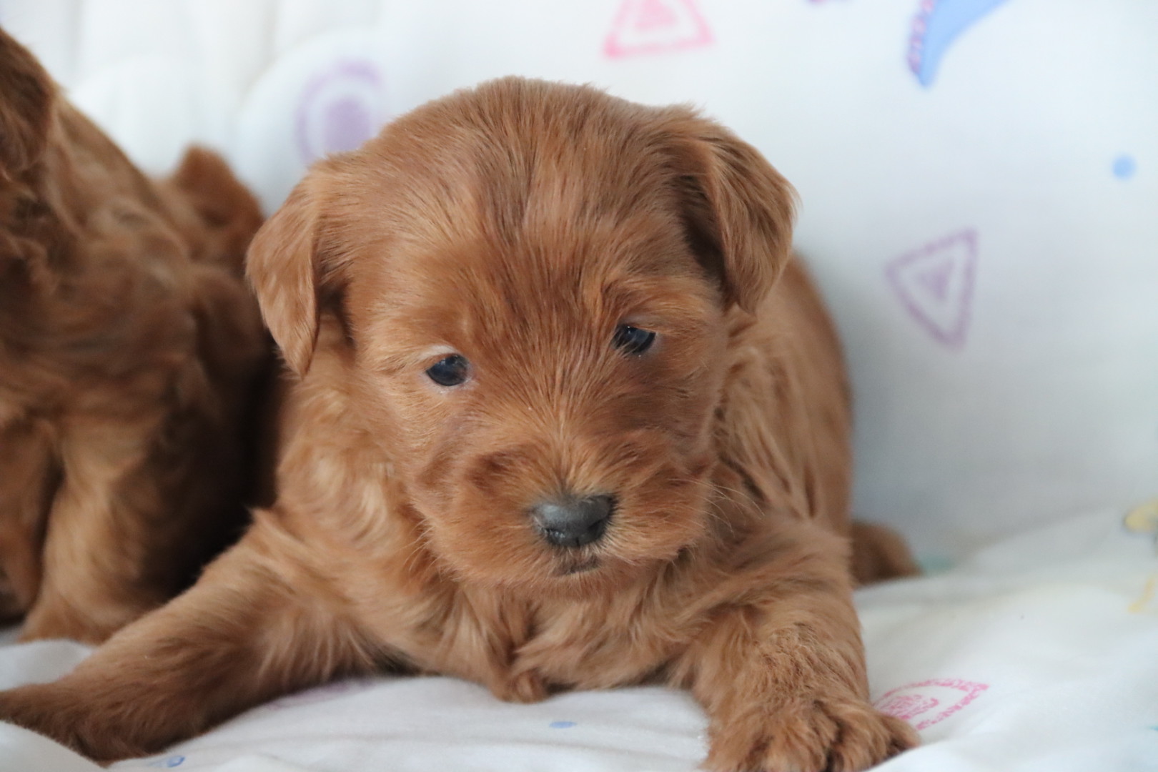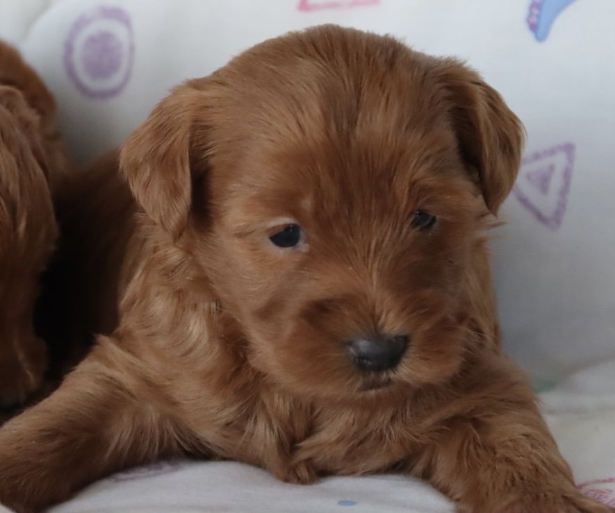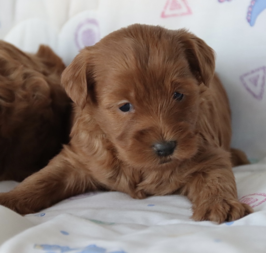 CLOVER is a petite, teddy-bear-featured deep red girl expected to have a silky, low-to-non shedding hypoallergenic coat. Projected adult weight is approximately 8–9 pounds, making her an ideal tiny companion for families or lap-dog homes. Clover Kiss is anticipated to have a loving, gentle, slightly playful personality with strong bonding tendencies — a hallmark of well-bred Maltipoos. With strong red genetics from Phoenix and refined structure from Chloe, she is expected to hold her rich coloring beautifully into adulthood. Born January 6, 2026, and ready March 6, 2026.