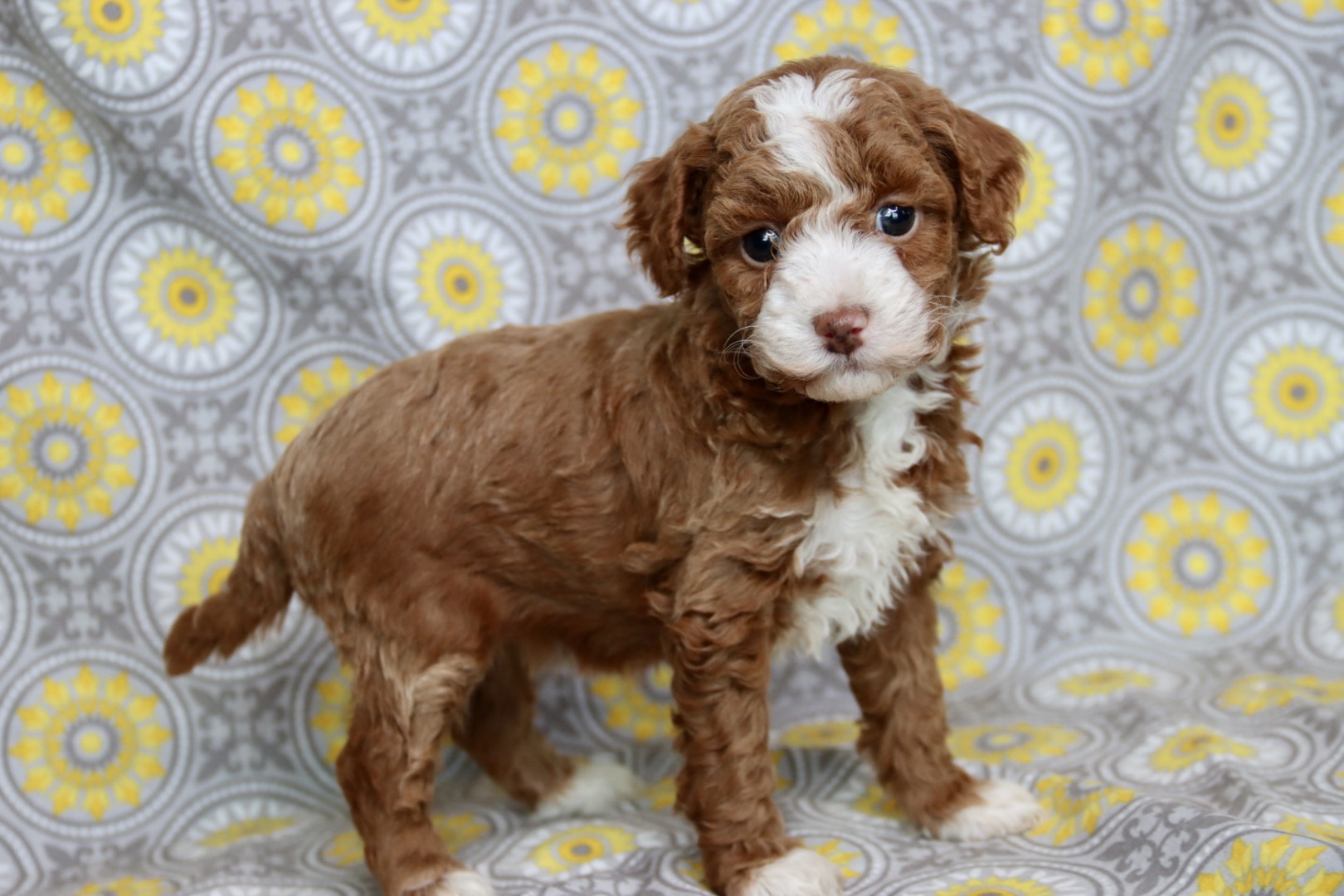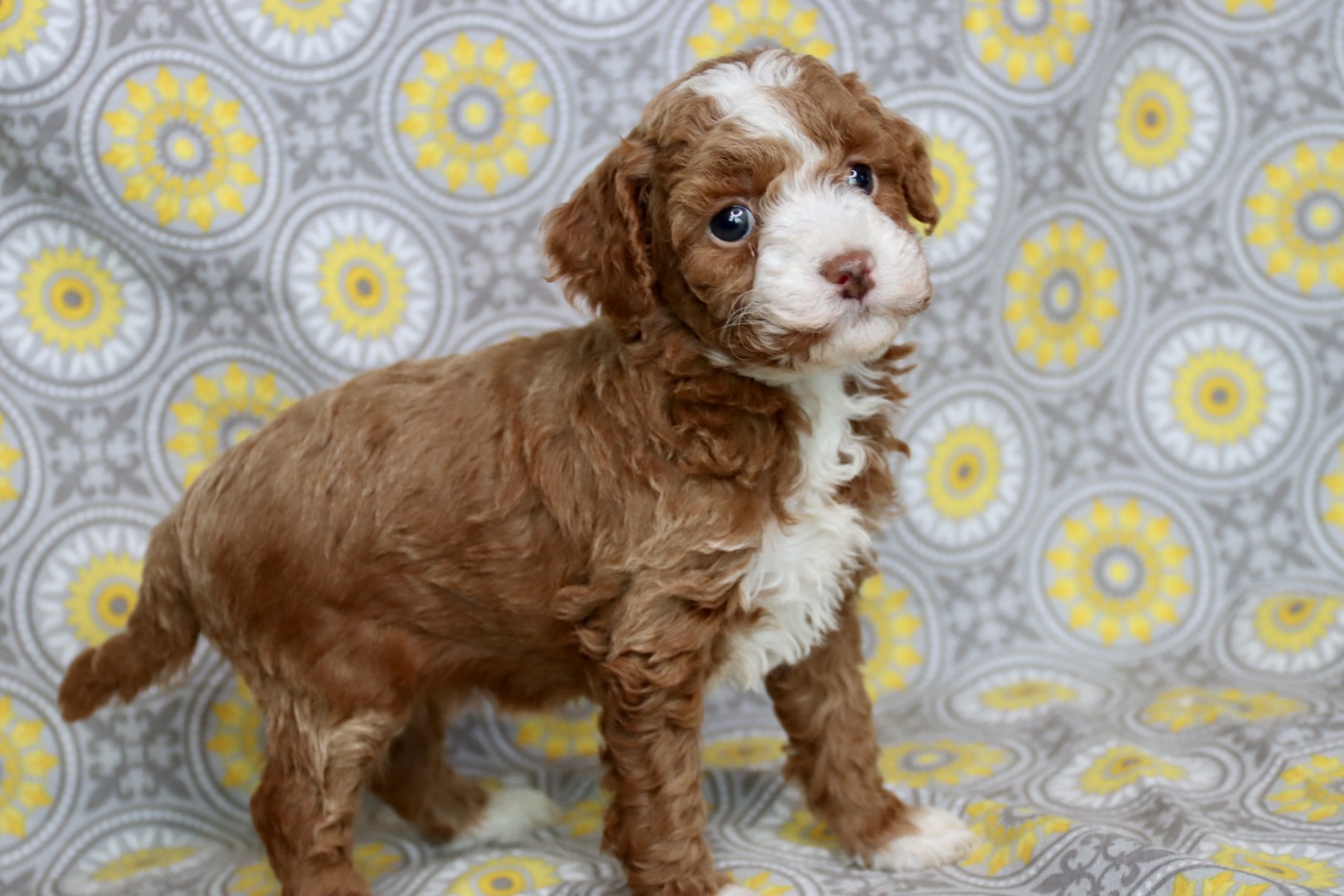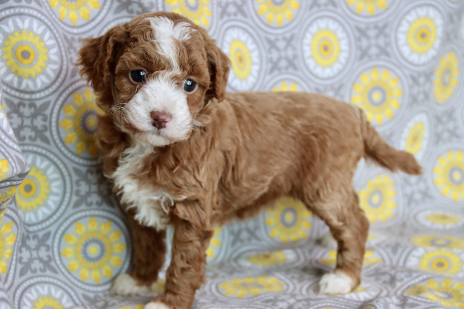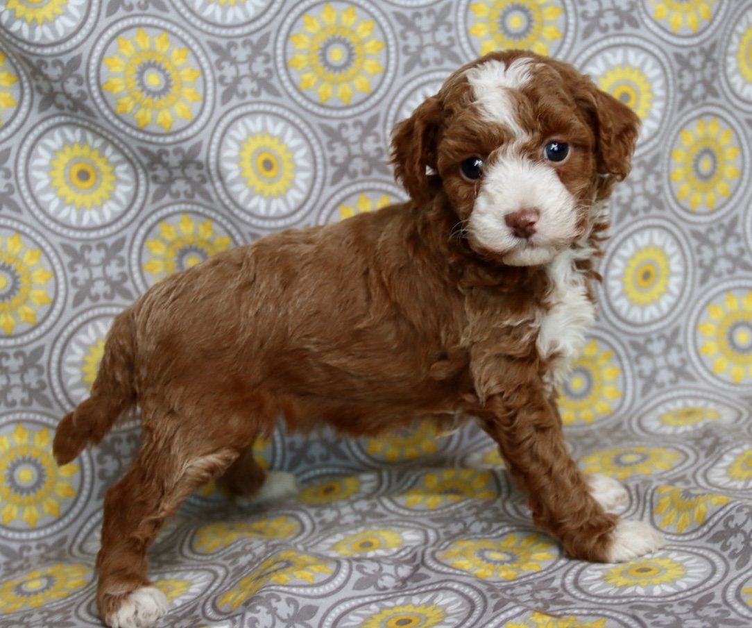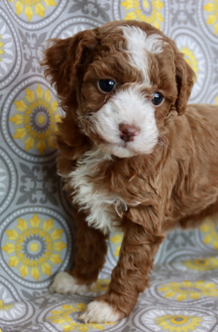 A Maltipoo is also one of the best first-time dog breeds you can bring home. They are gentle, intelligent, easy to train, and wonderfully family-friendly. With the loving sweetness of the Maltese and the smart, hypoallergenic qualities of the Poodle, this breed fits beautifully into homes with children, first-time owners, and anyone wanting a loyal, cuddly companion. NOEL is an incredibly rare  red tuxedo Maltipoo