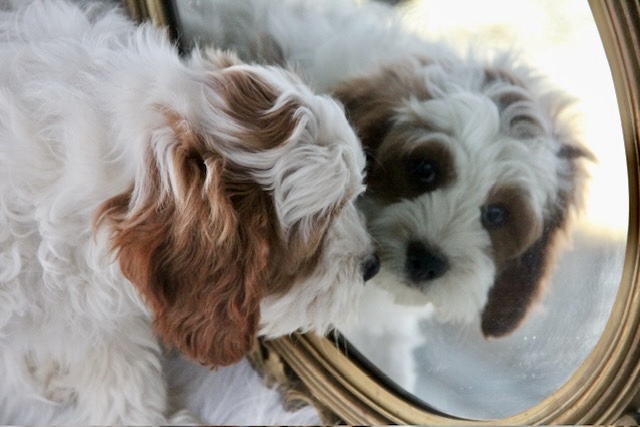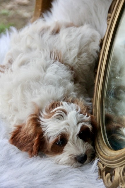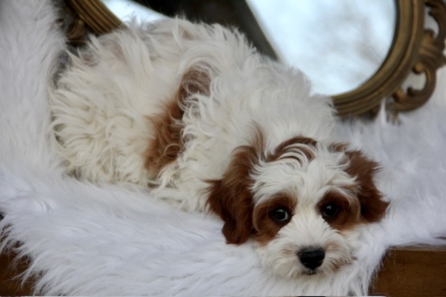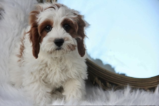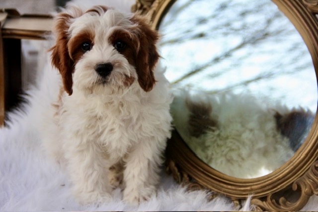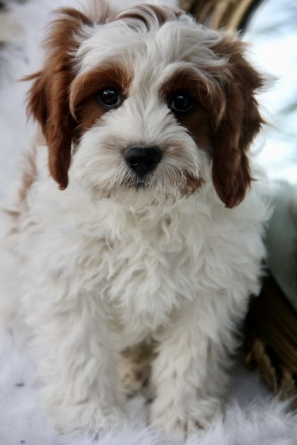 Ethan is a stunning red and white Blenheim Cavapoo with the softest, fluffiest wavy coat. As an F1 Cavapoo (first generation), he carries the best of both worlds — the sweetness of the Cavalier and the intelligence of the Poodle — all wrapped up in a very low-shedding, family-friendly coat.