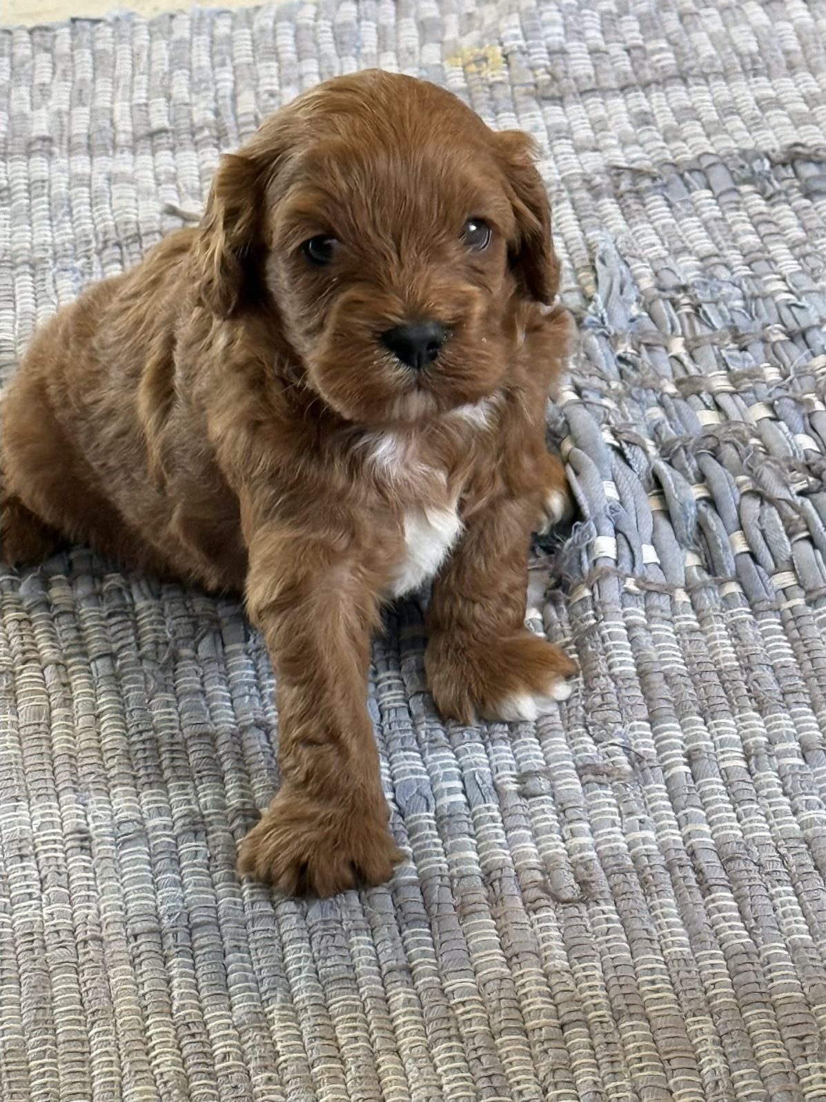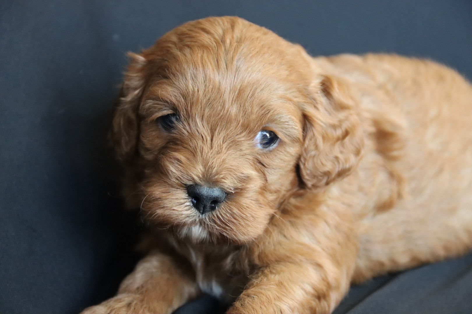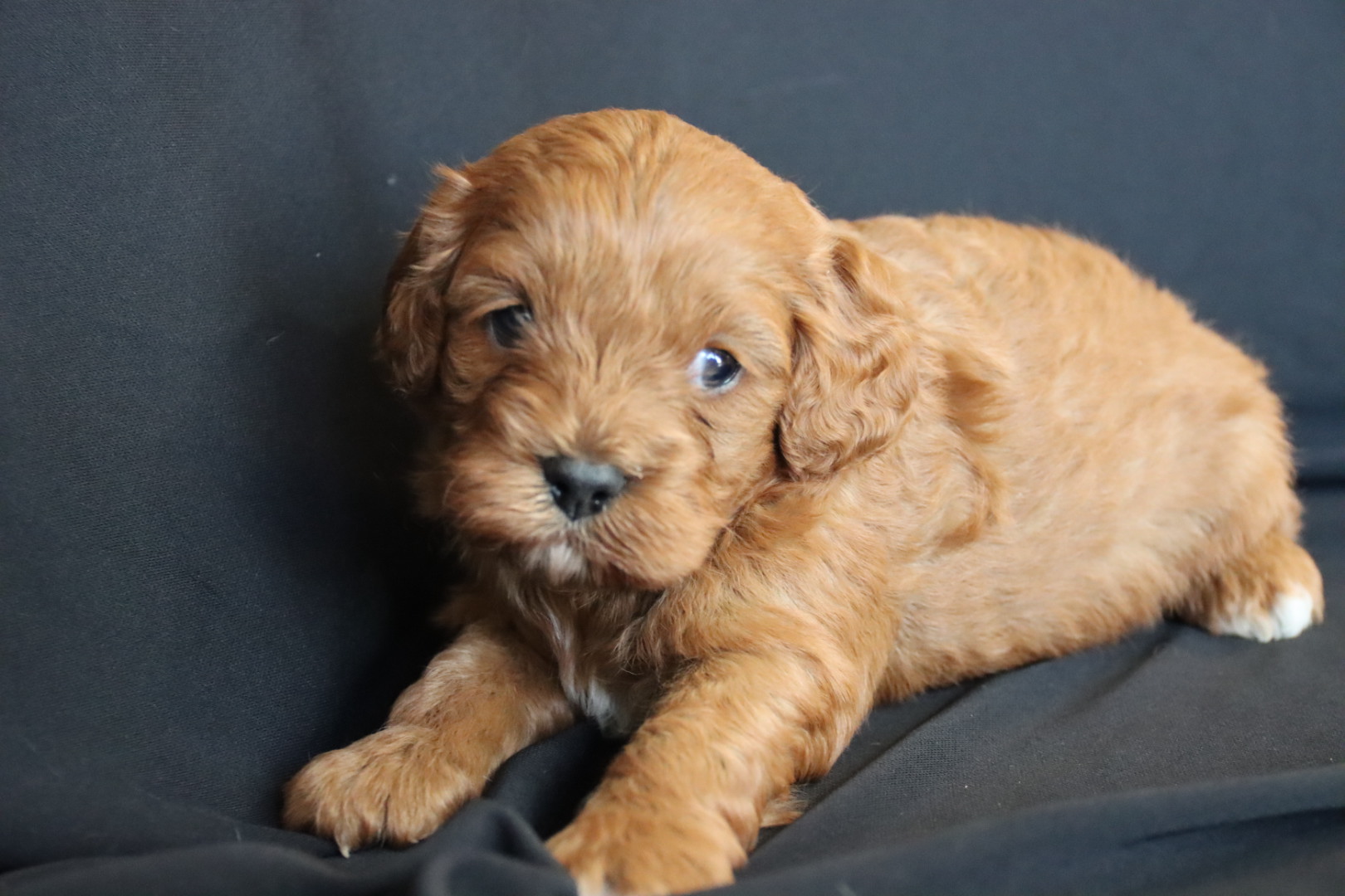 Crimson King, the handsome solid-red boy, is confident, affectionate, and already shows that loyal “best friend” energy Cavapoos are famous for. He’s the kind of puppy who wants to be right by your side—whether that’s following you from room to room or curling up next to you at the end of the day. True to the Cavapoo nickname, he’s a classic Velcro pup: devoted, people-focused, and deeply connected to his family.