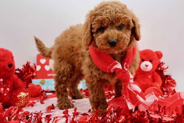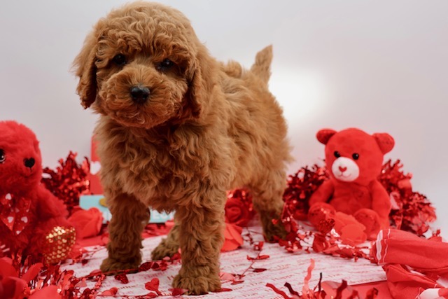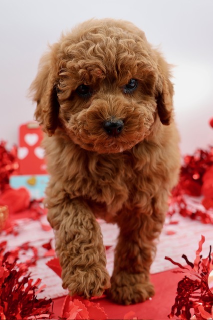 We are thrilled to announce a rare and breathtaking litter of four male dark red F1b Maltipoos — the deepest, richest red you’ll find in this breed! Pictures taken on 12.21.25