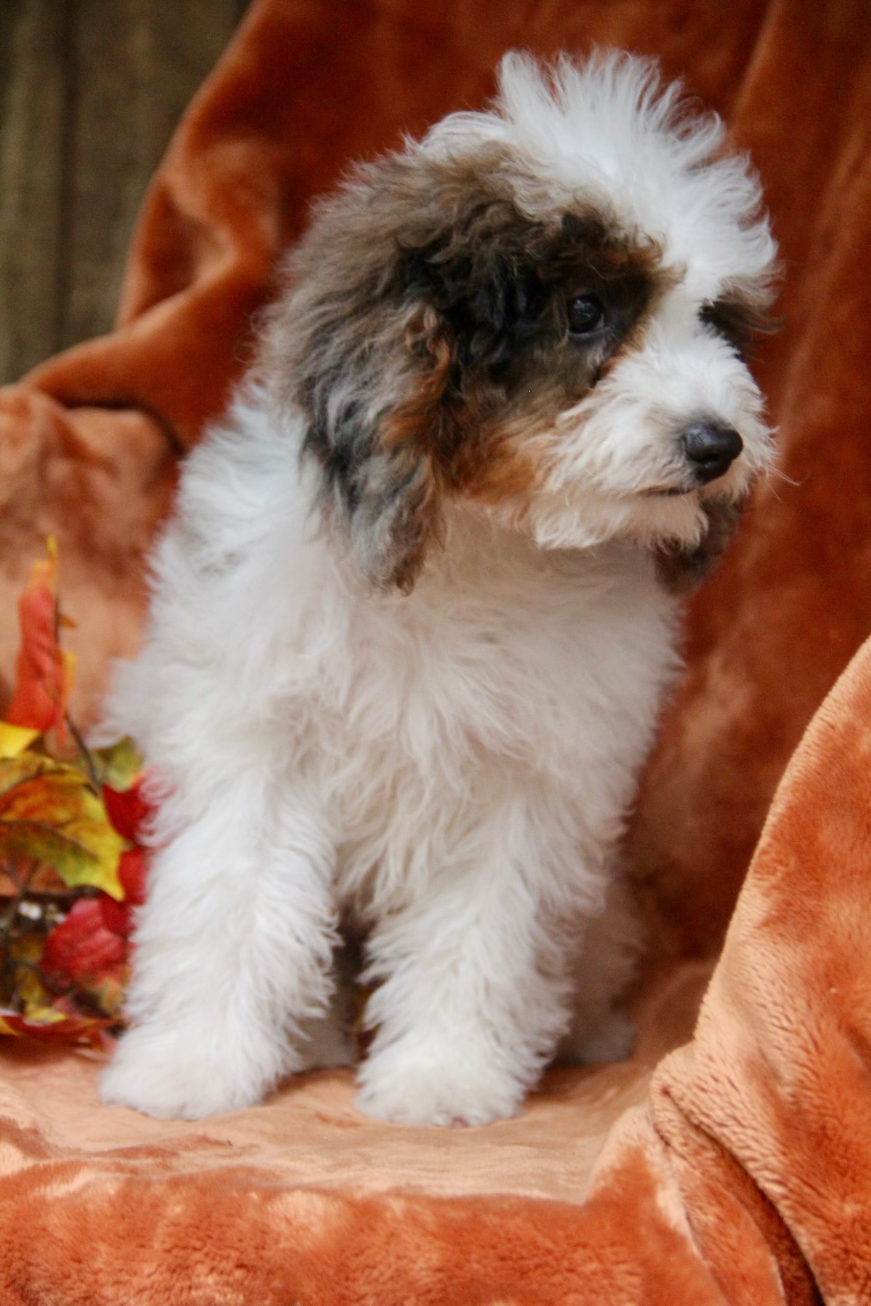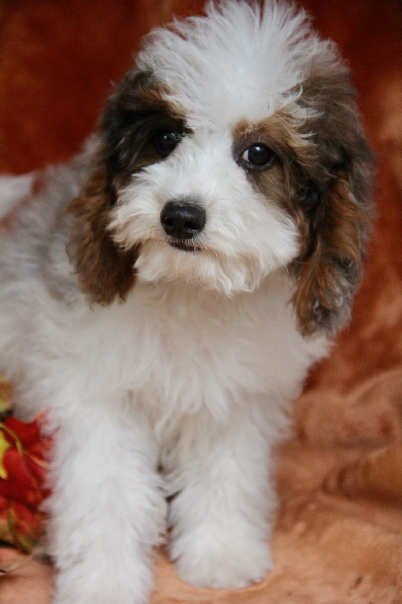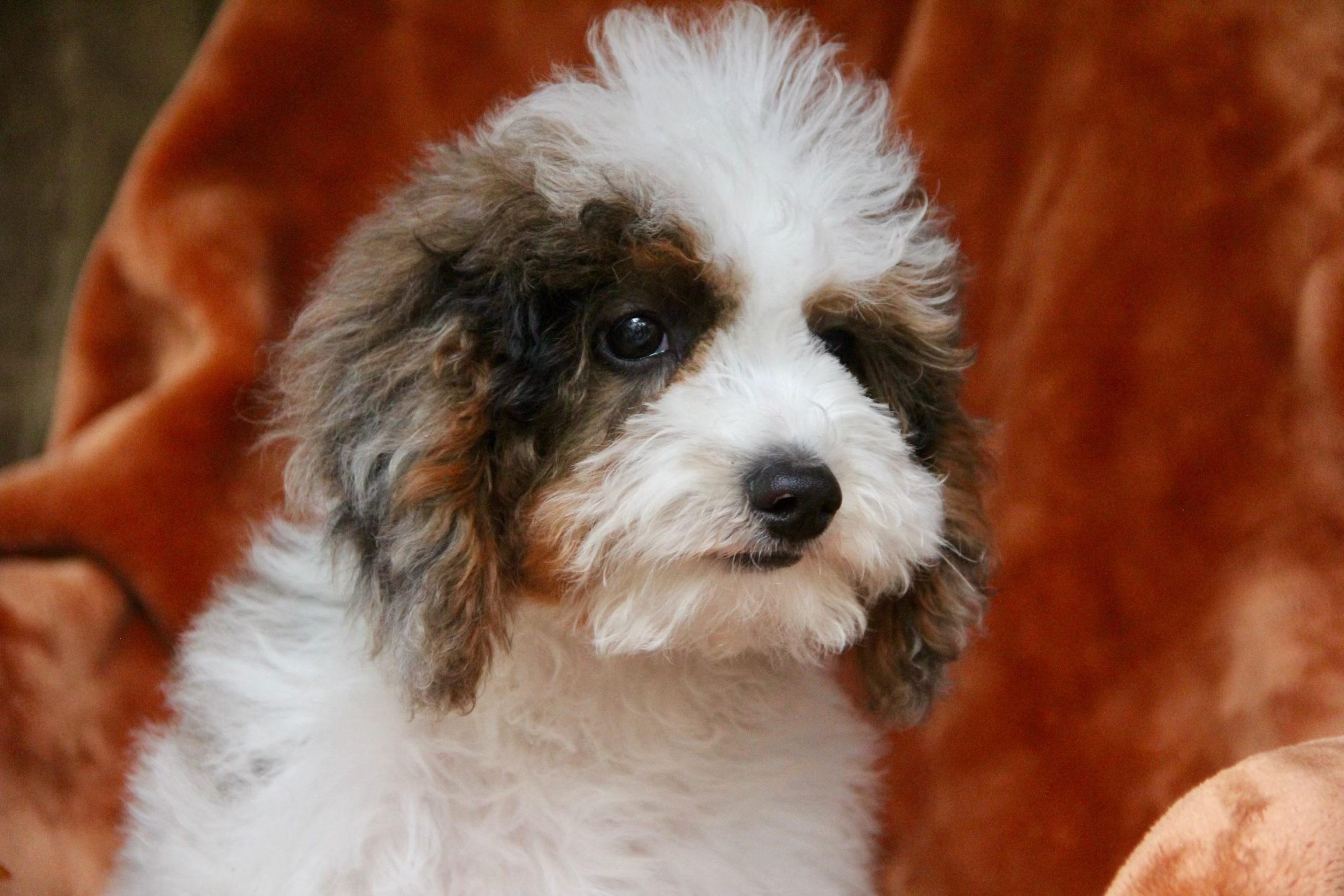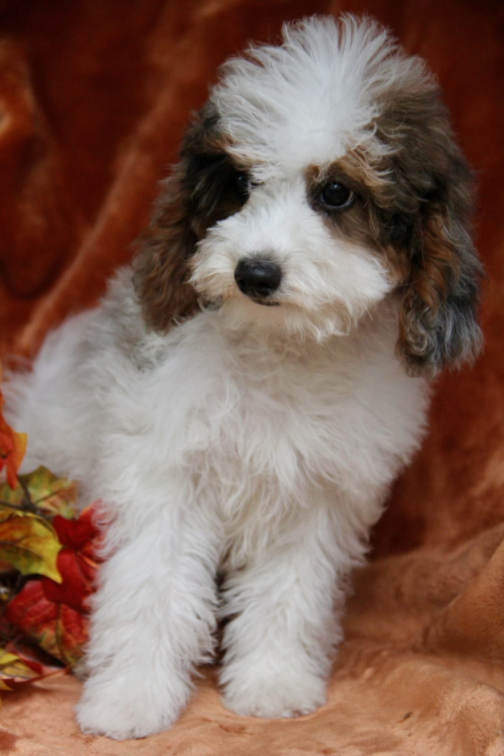 Orbit is a true rarity — a Blue Merle Phantom F1B Cavapoo, a color combination almost never seen and incredibly hard to produce. His striking markings, soulful eyes, and teddy-bear expression make him one of the standout puppies of this entire season.