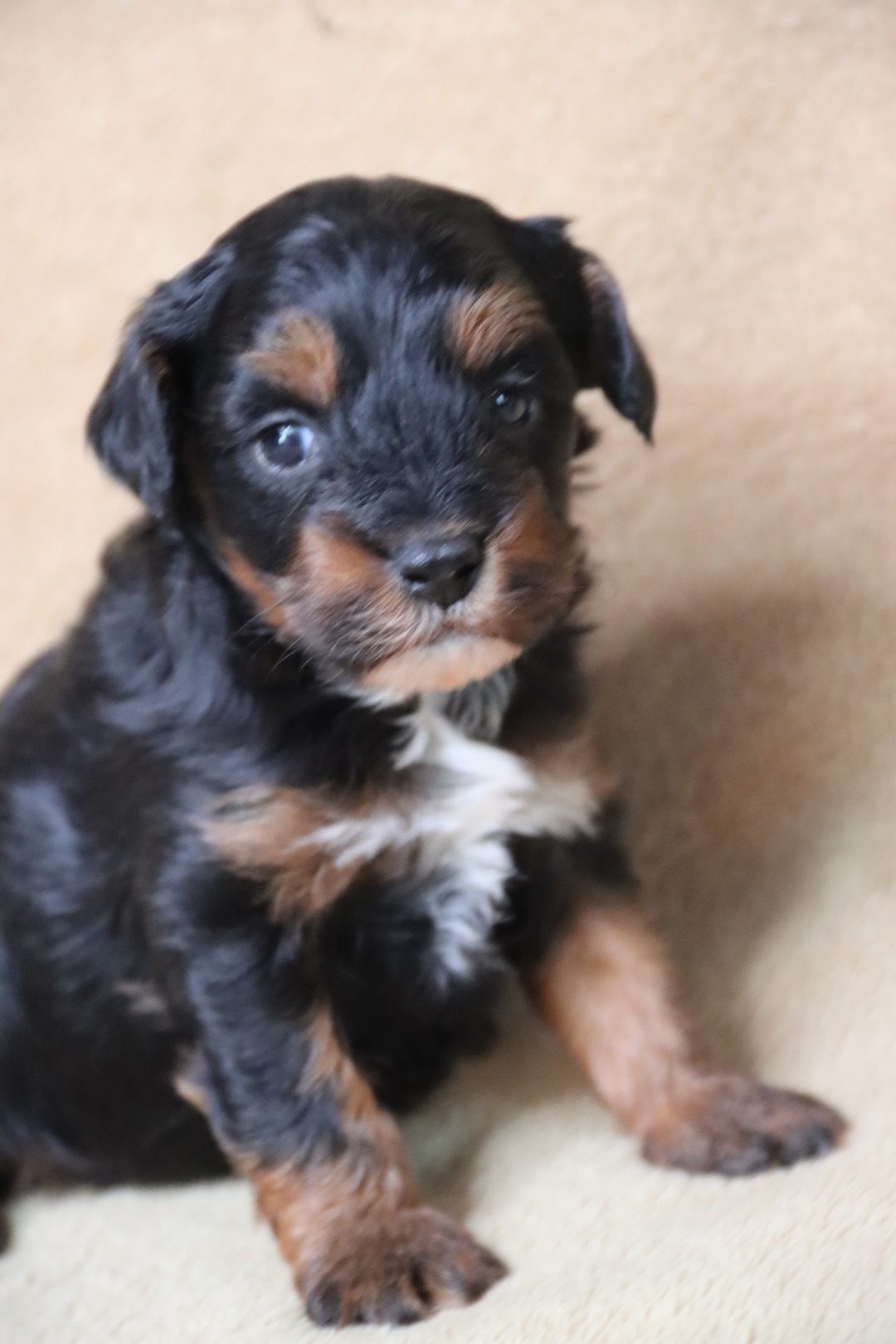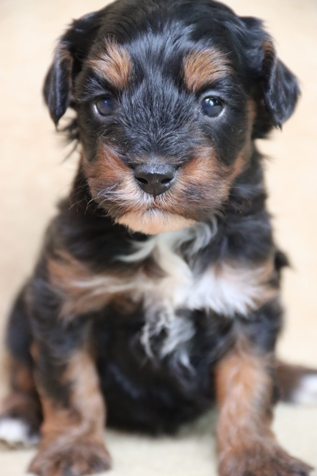 Meet an extraordinary little boy, a rare tri-phantom Maltipoo β a color combination that is incredibly difficult to produce and something that does not come along often in Maltipoo breeding programs. His striking markings give him a rich, dramatic look that truly sets him apart from the typical solid or abstract coats.