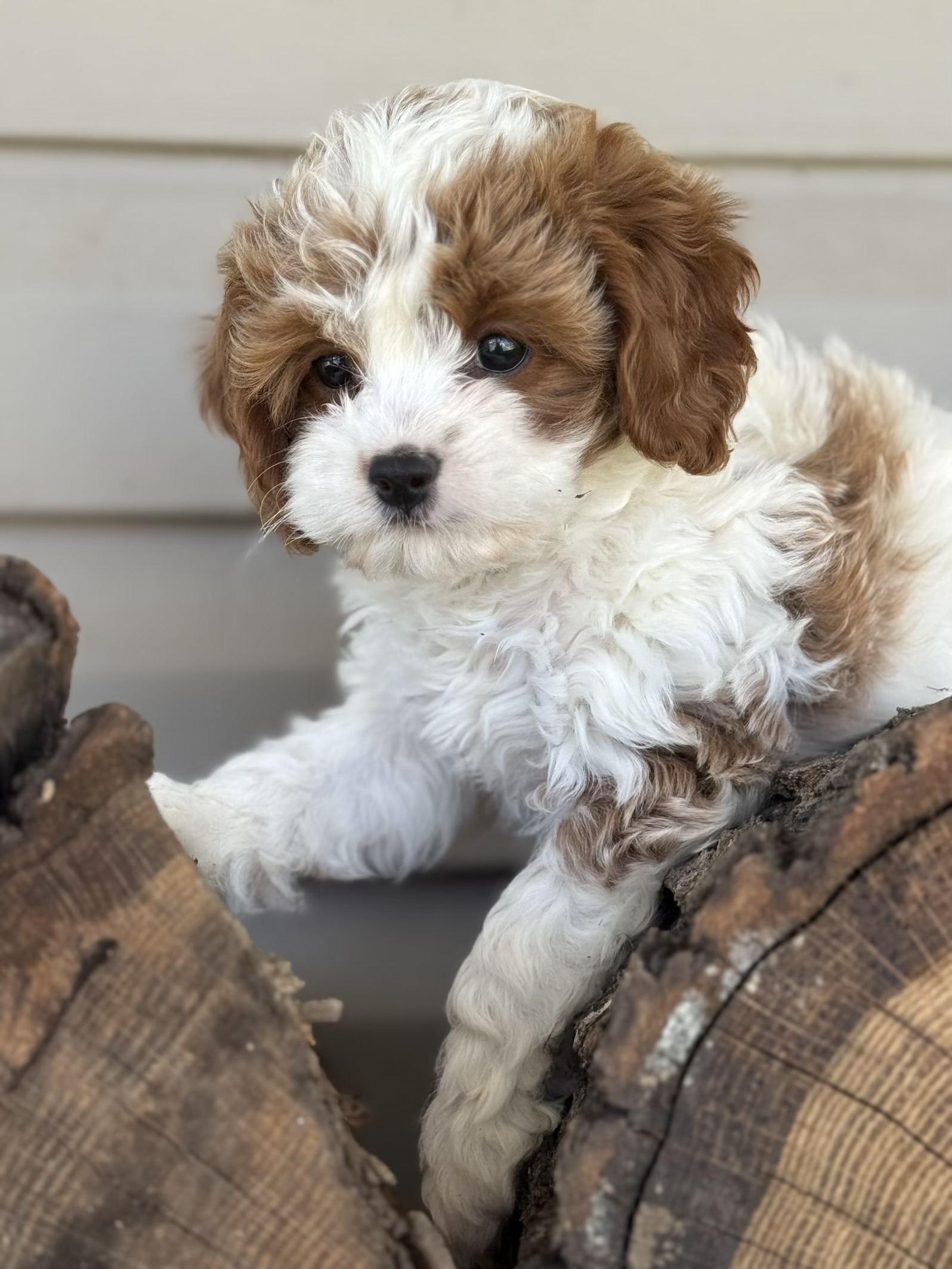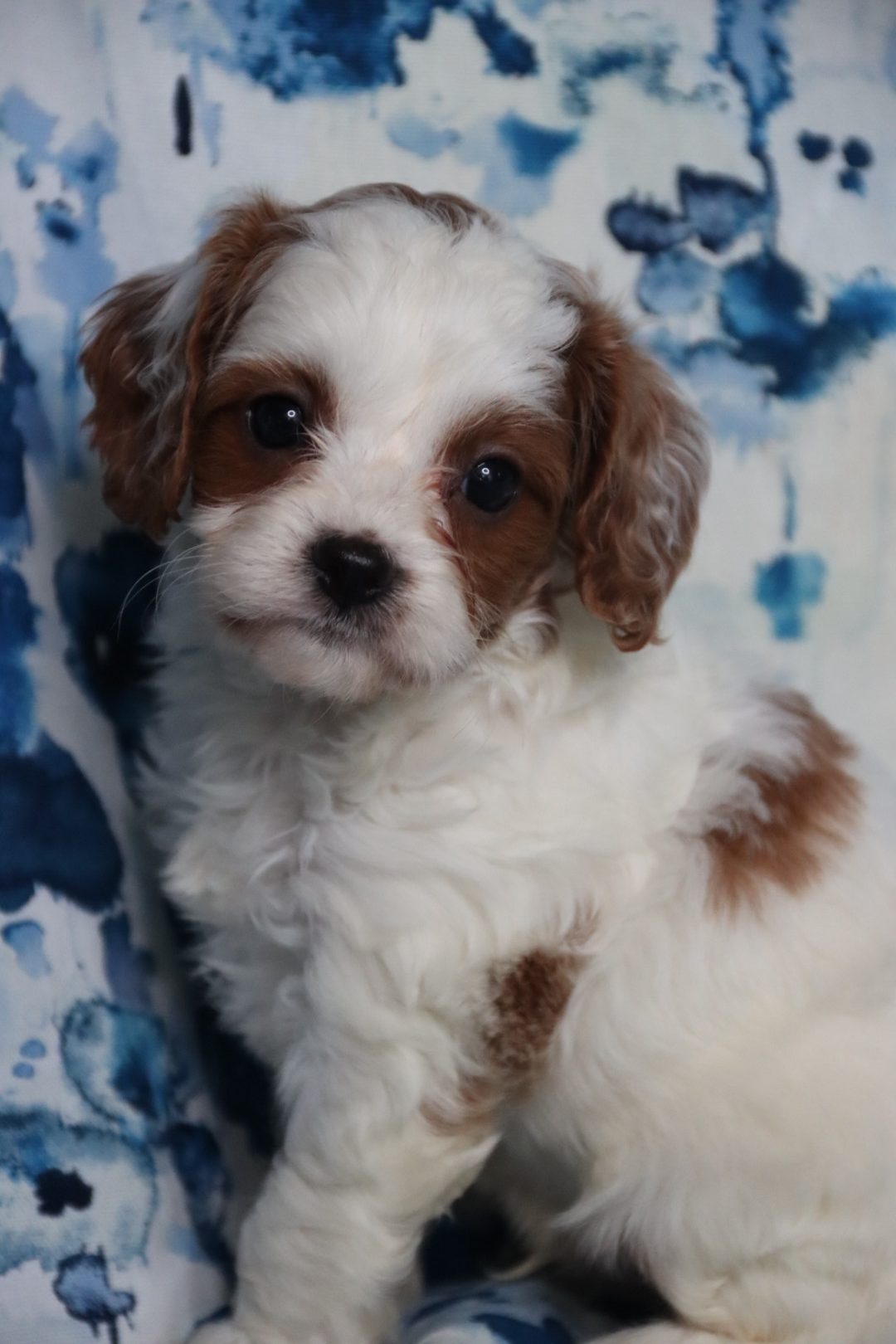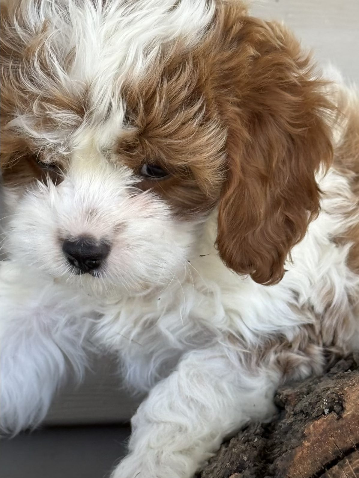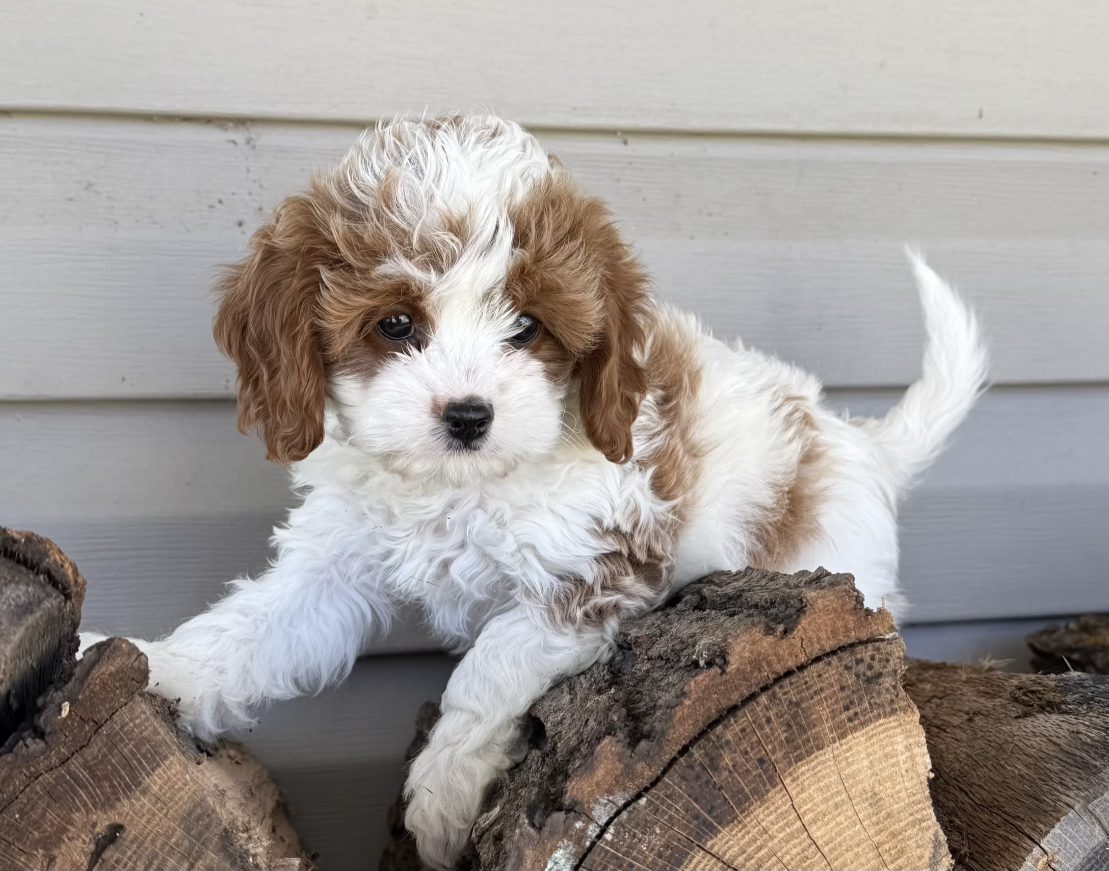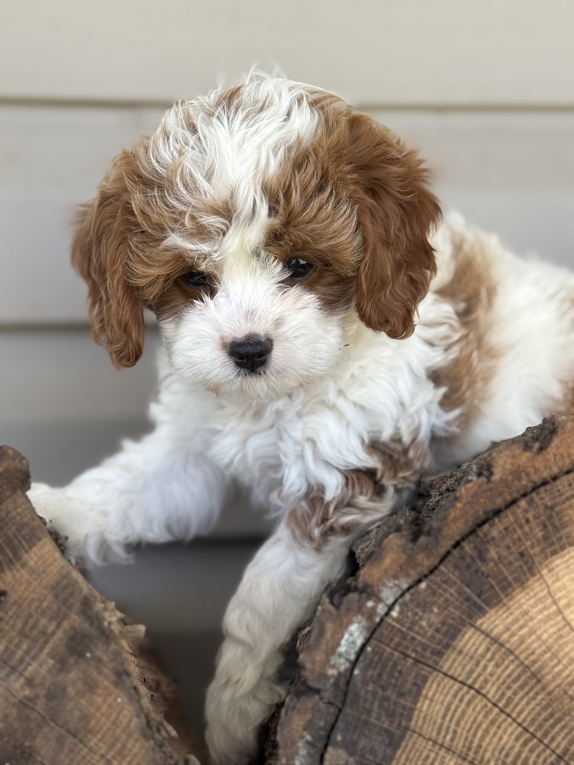 MEET BRAIR a red and white Cavapoo Boy briar is a charming, red and white party cava poo boy with a soft expressive face and a personality that instantly draws people in he is expected to reach an adult weight of around 12 pounds making him the perfect small companion for families, couples or anyone wanting a loving lap dog that is still playful, and active caps are one of the most sought after designer breeds because they combine the gentle affectionate nature of the cavalier, King Charles spaniel and the intelligence of the Poodle they are known for being low shedding, making them a wonderful option for many families who prefer a cleaner home and more allergy, friendly pet cava poos are also famous for their loving temperament, strong bond with their owners and wonderful compatibility with children and other pets, making them an ideal, family companion briar will be ready for his new home anytime after March 23 and a $500 deposit will reserve him. Call Carrie for details 918.398.3715
