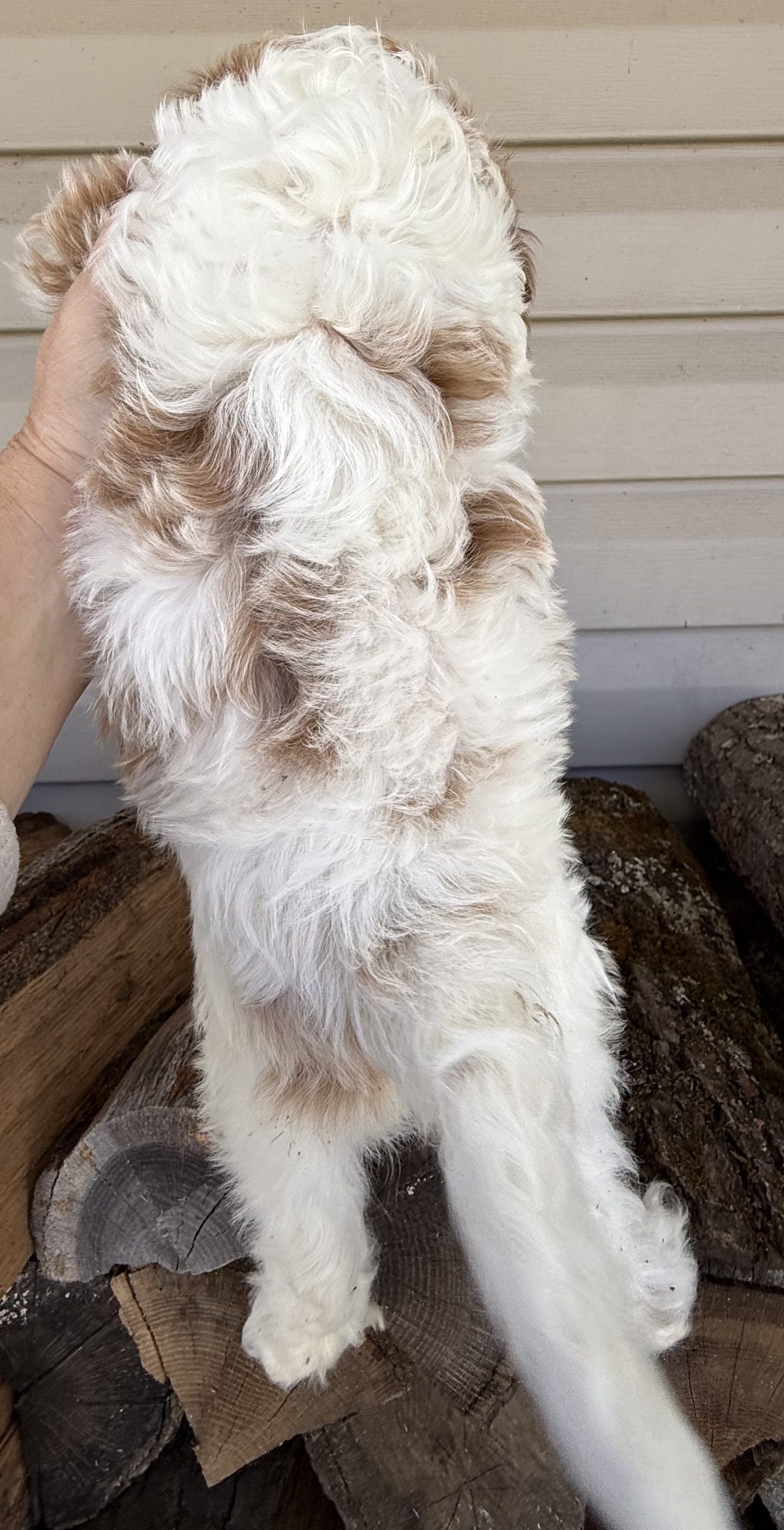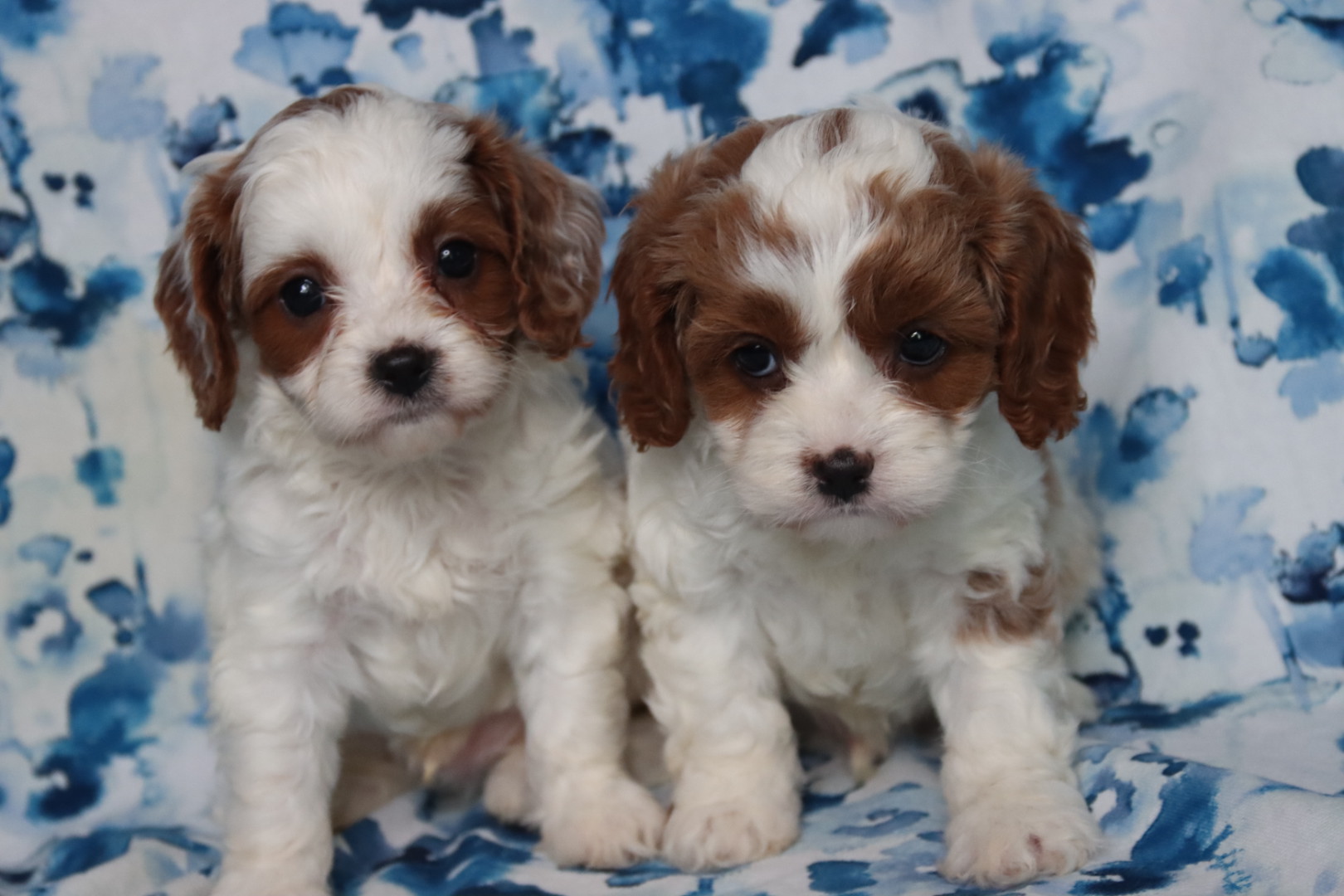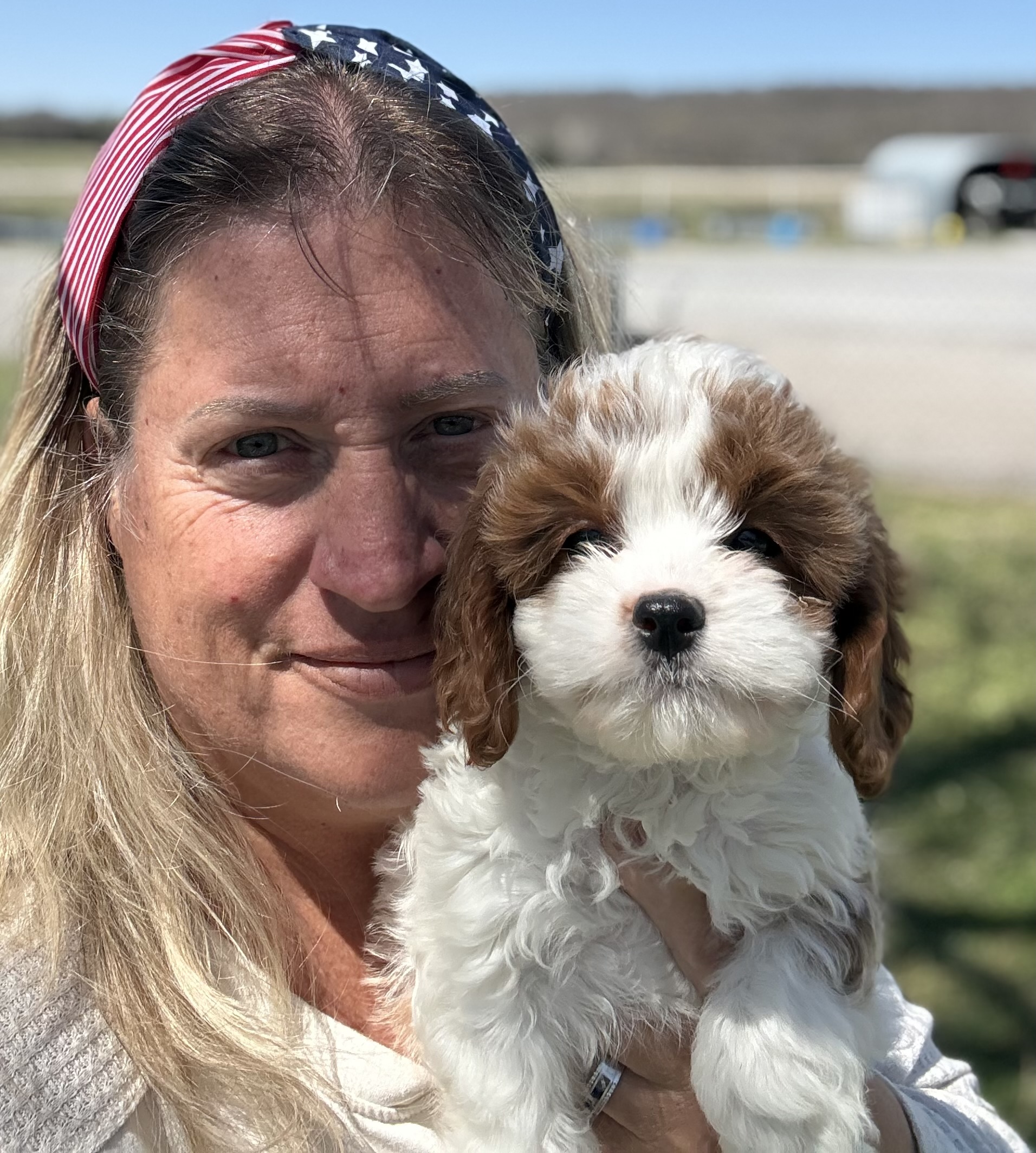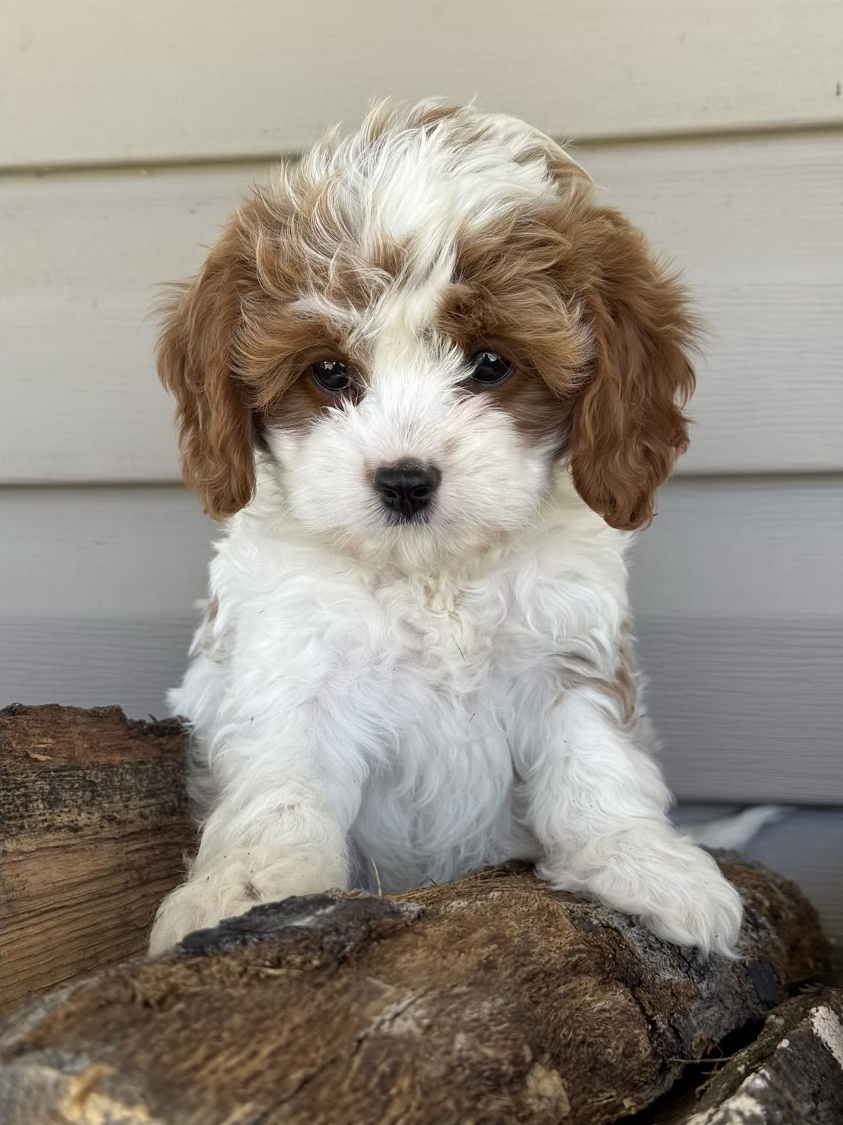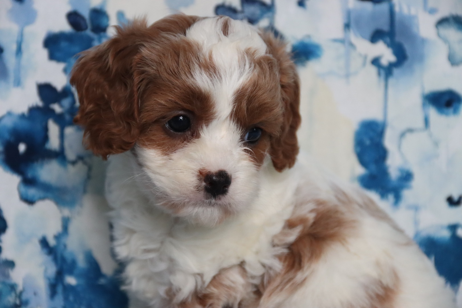 MEET BRAIR a red and white Cavapoo Boy briar is a charming, red and white party cava poo boy with a soft expressive face and a personality that instantly draws people in he is expected to reach an adult weight of around 12 pounds making him the perfect small companion for families, couples or anyone wanting a loving lap dog that is still playful, and active caps are one of the most sought after designer breeds because they combine the gentle affectionate nature of the cavalier, King Charles spaniel and the intelligence of the Poodle they are known for being low shedding, making them a wonderful option for many families who prefer a cleaner home and more allergy, friendly pet cava poos are also famous for their loving temperament, strong bond with their owners and wonderful compatibility with children and other pets, making them an ideal, family companion briar will be ready for his new home anytime after March 23 and a $500 deposit will reserve him. Call Carrie for details 918.398.3715