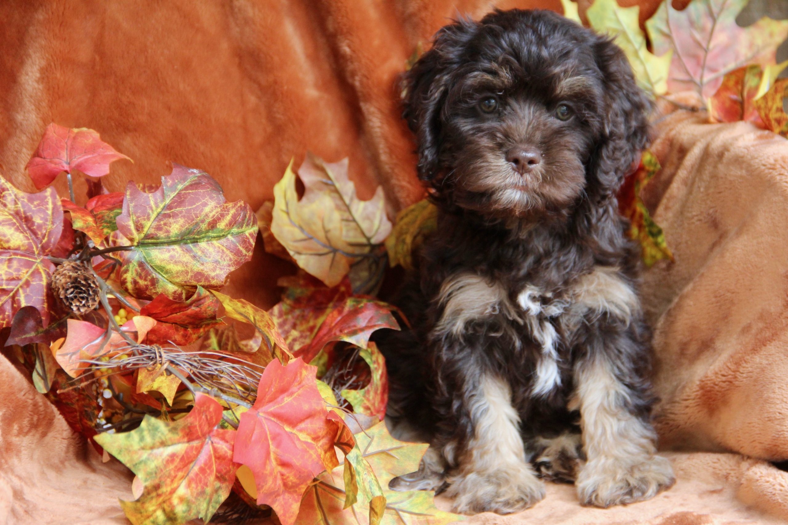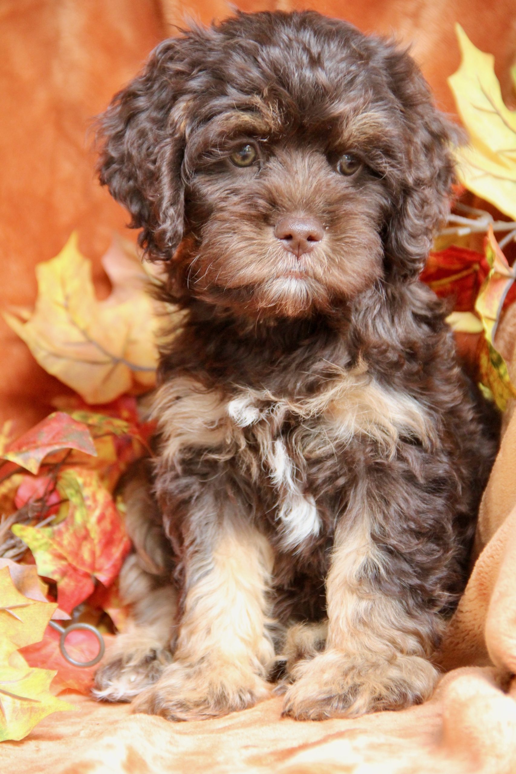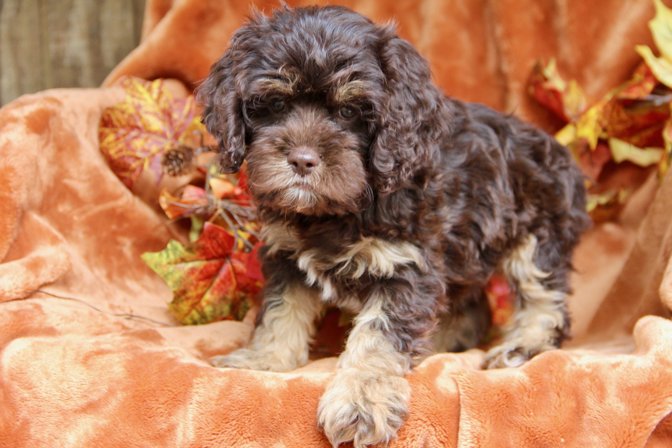 Our handsome trio of F1 Cavapoo boys are dressed in rich fall shades of chocolate and apricot. Born August 28, these little gentlemen will be ready to join their forever families on October 24. Expected to reach 13–15 lbs full grown, they’re the perfect size for snuggles on the couch or adventures outdoors.
