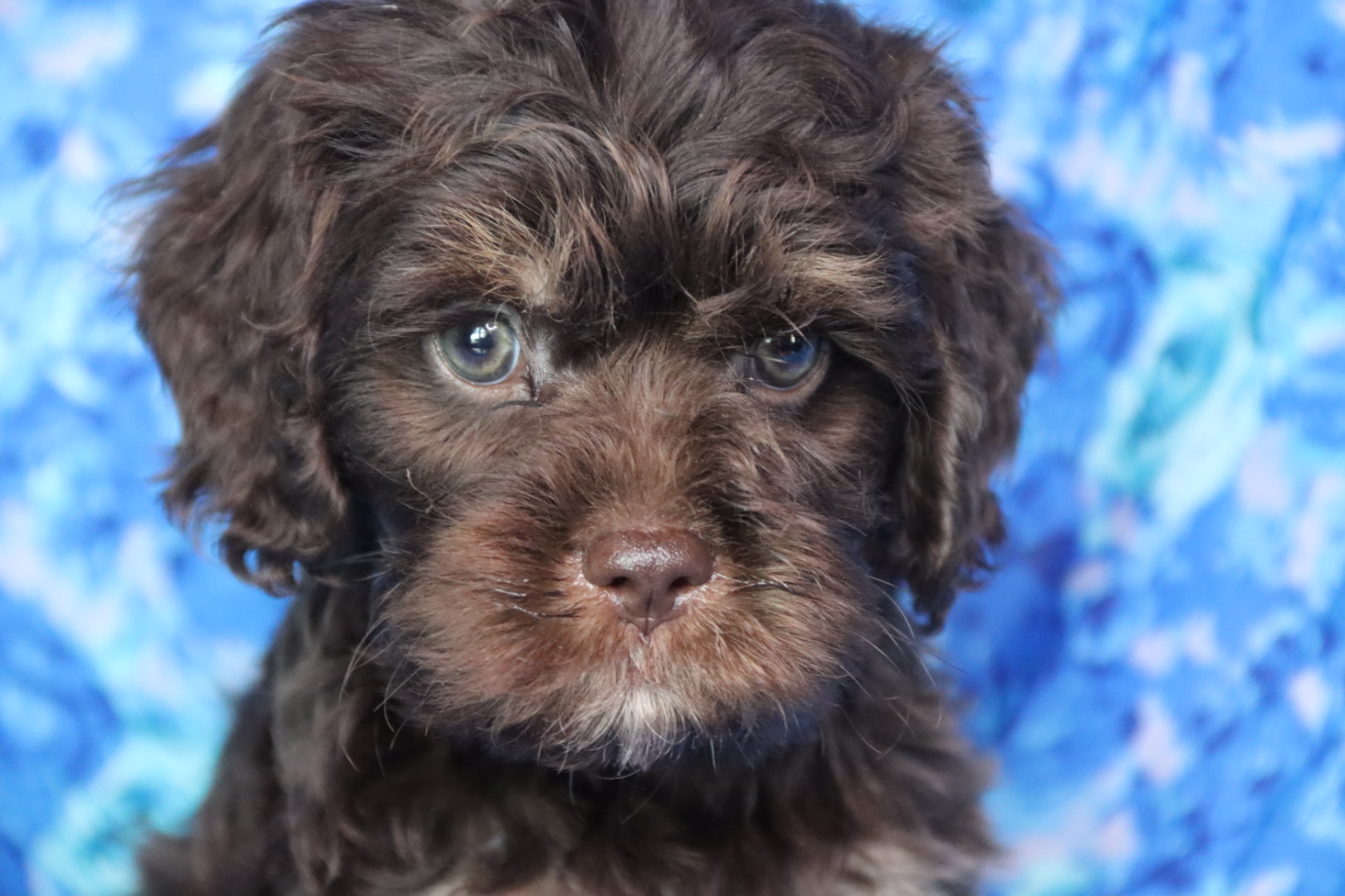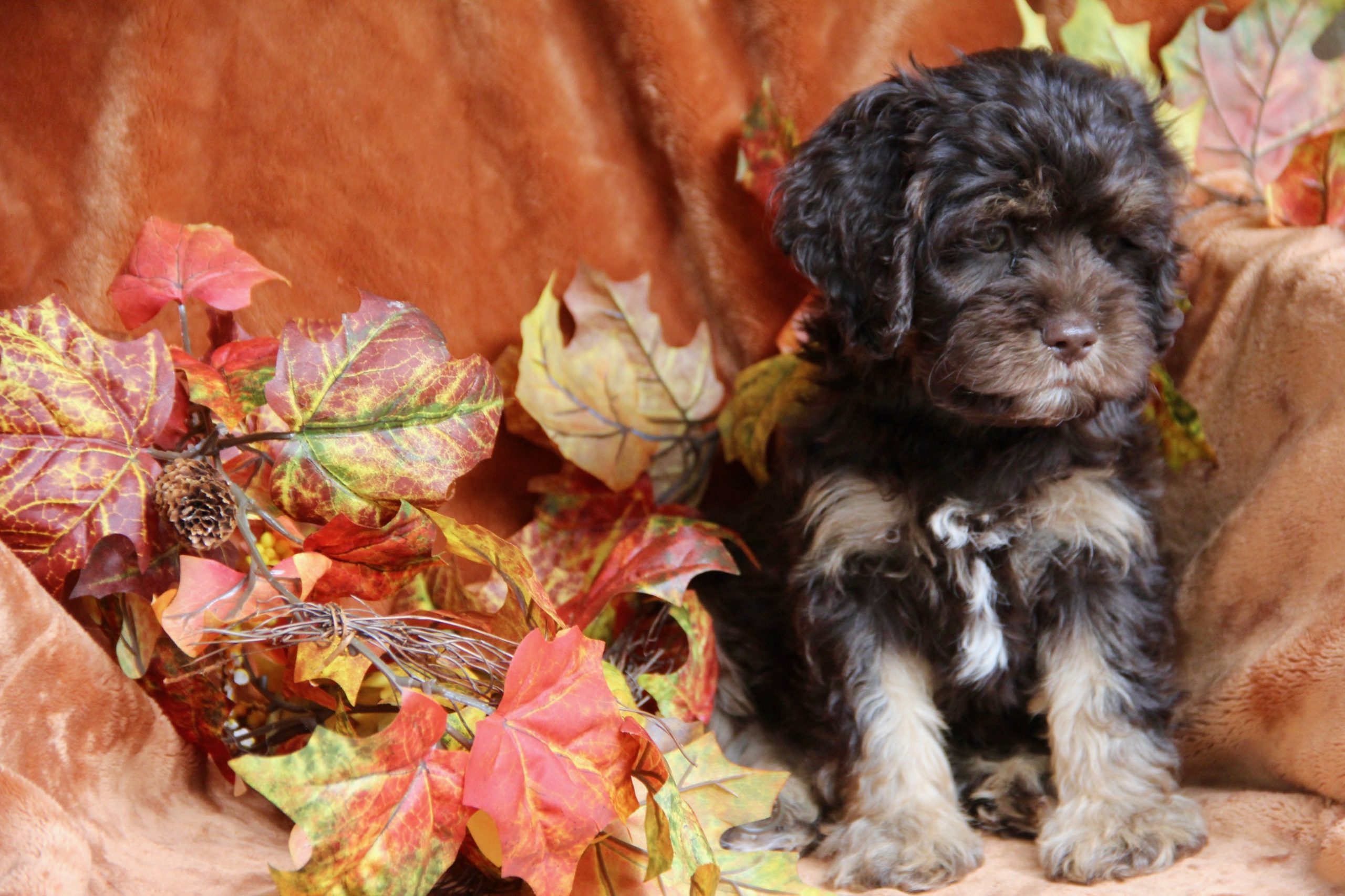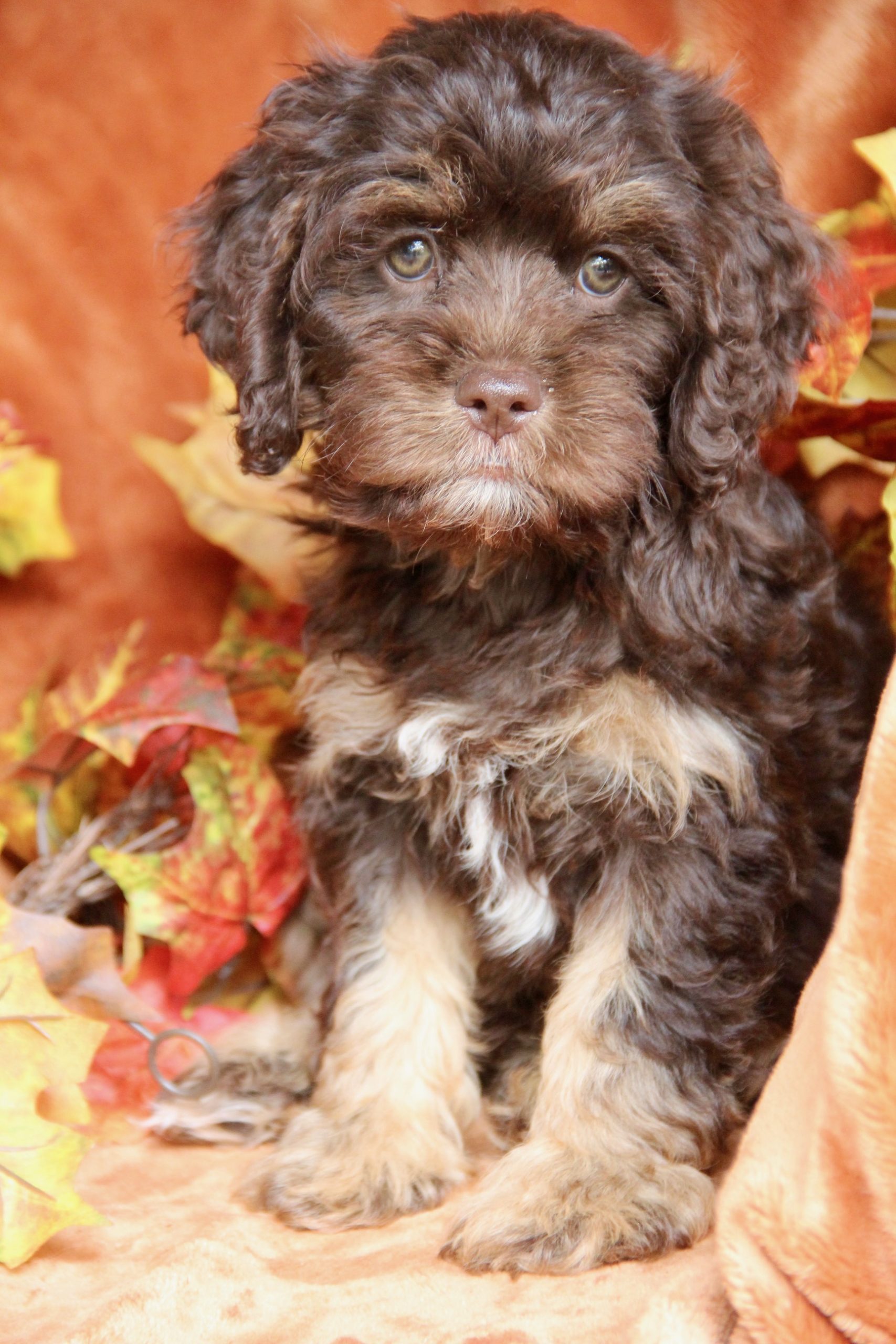 Our handsome trio of F1 Cavapoo boys are dressed in rich fall shades of chocolate and apricot. Born August 28, these little gentlemen will be ready to join their forever families on October 24. Expected to reach 13–15 lbs full grown, they’re the perfect size for snuggles on the couch or adventures outdoors.